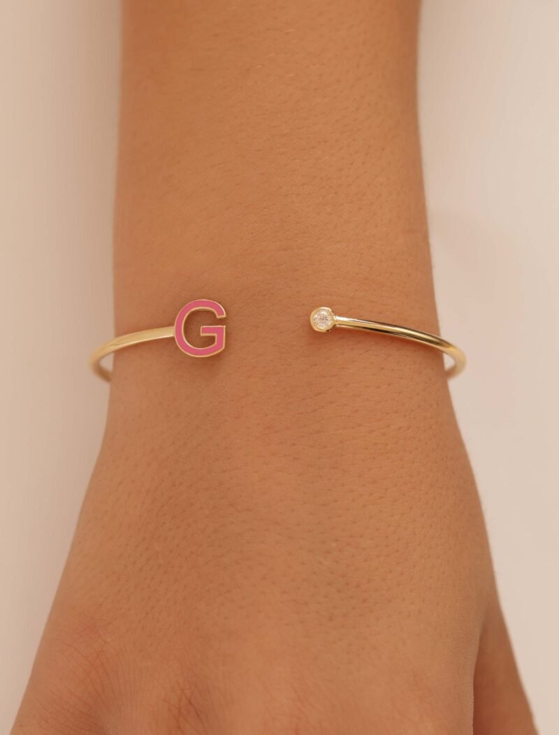 18K Gold Newborn Enamel Initial Open Bangle Flex Bracelet