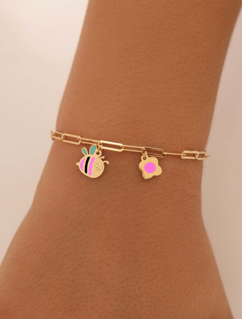 18K Gold Paperclip Bee & Flower Newborn Bracelet