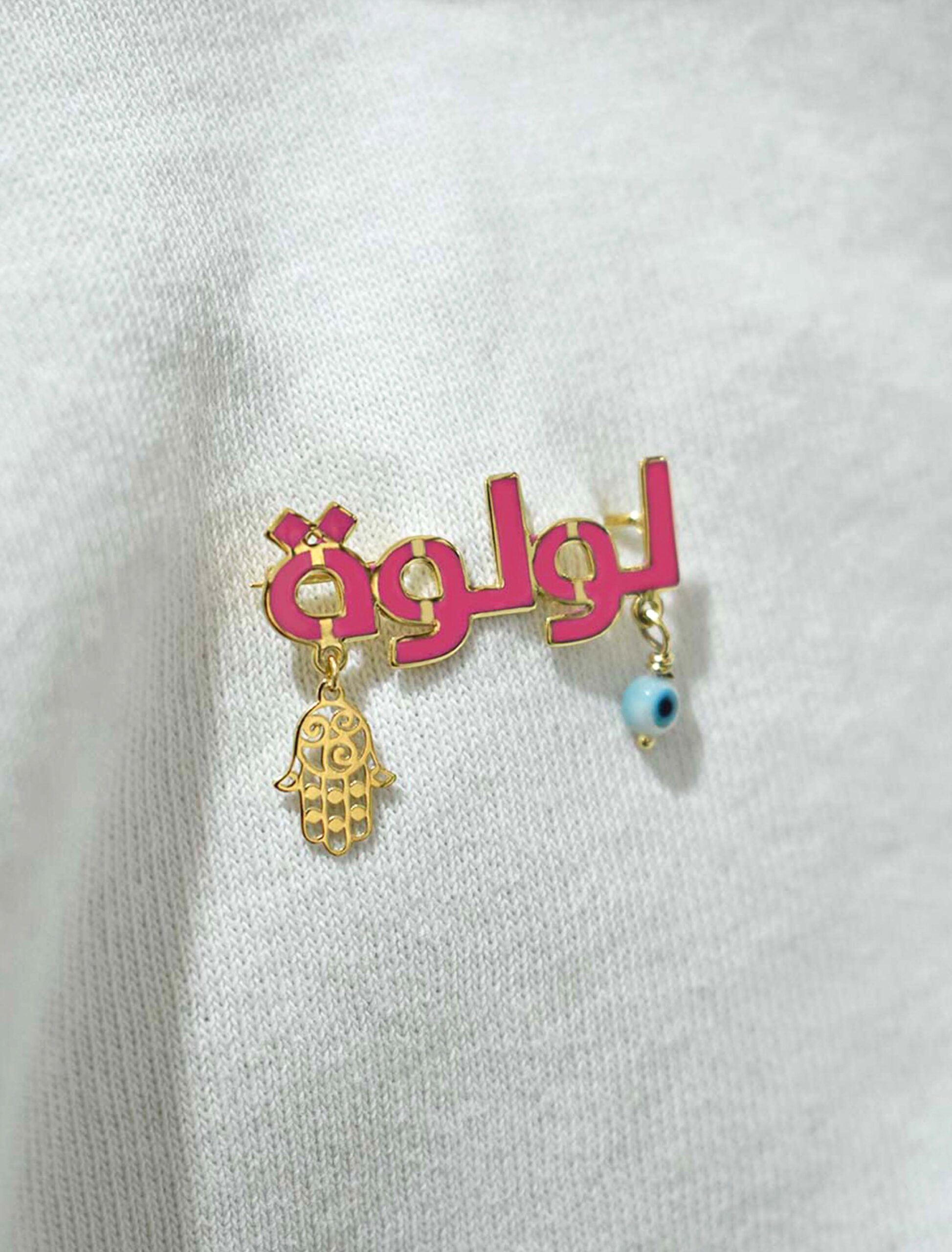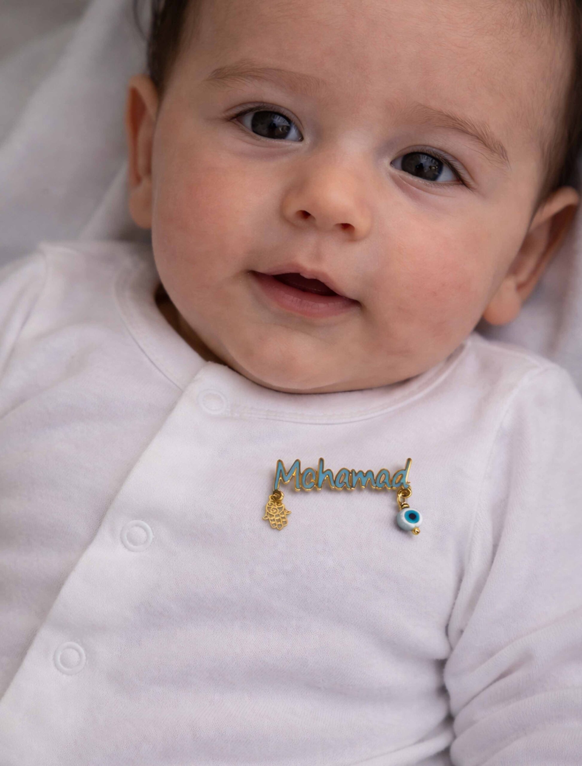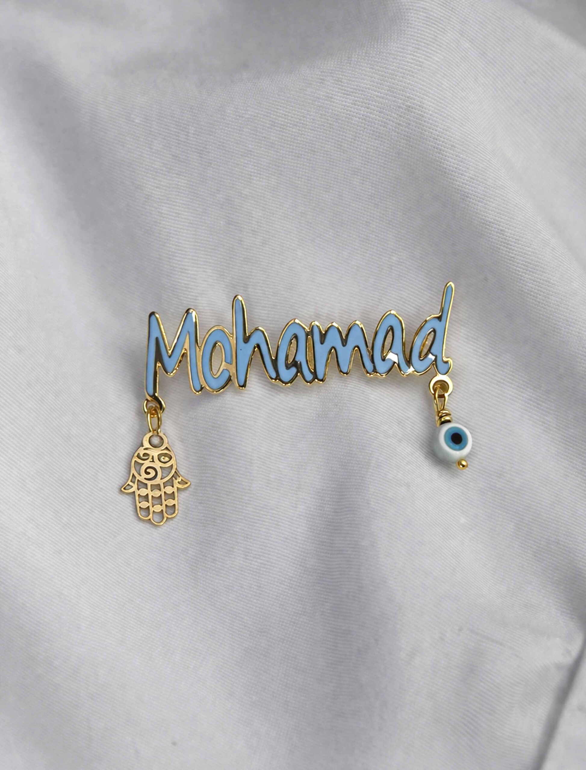 A refined statement piece that blends elegance with symbolism. This personalized pin features a beautifully crafted name accented by protective charms, representing luck, safety, and positive energy. Thoughtfully designed for daily wear, it’s a meaningful keepsake made to be cherished.