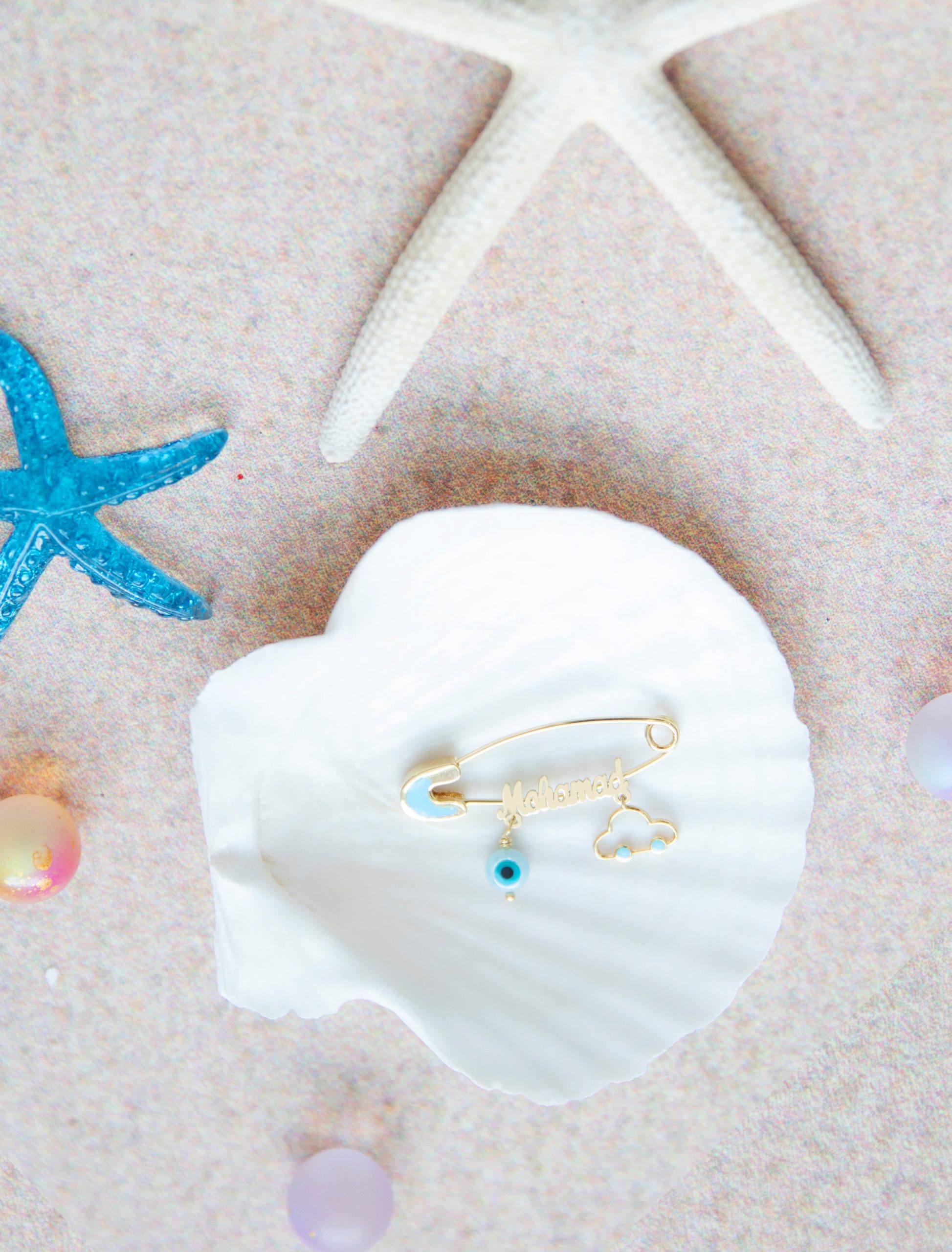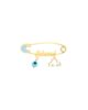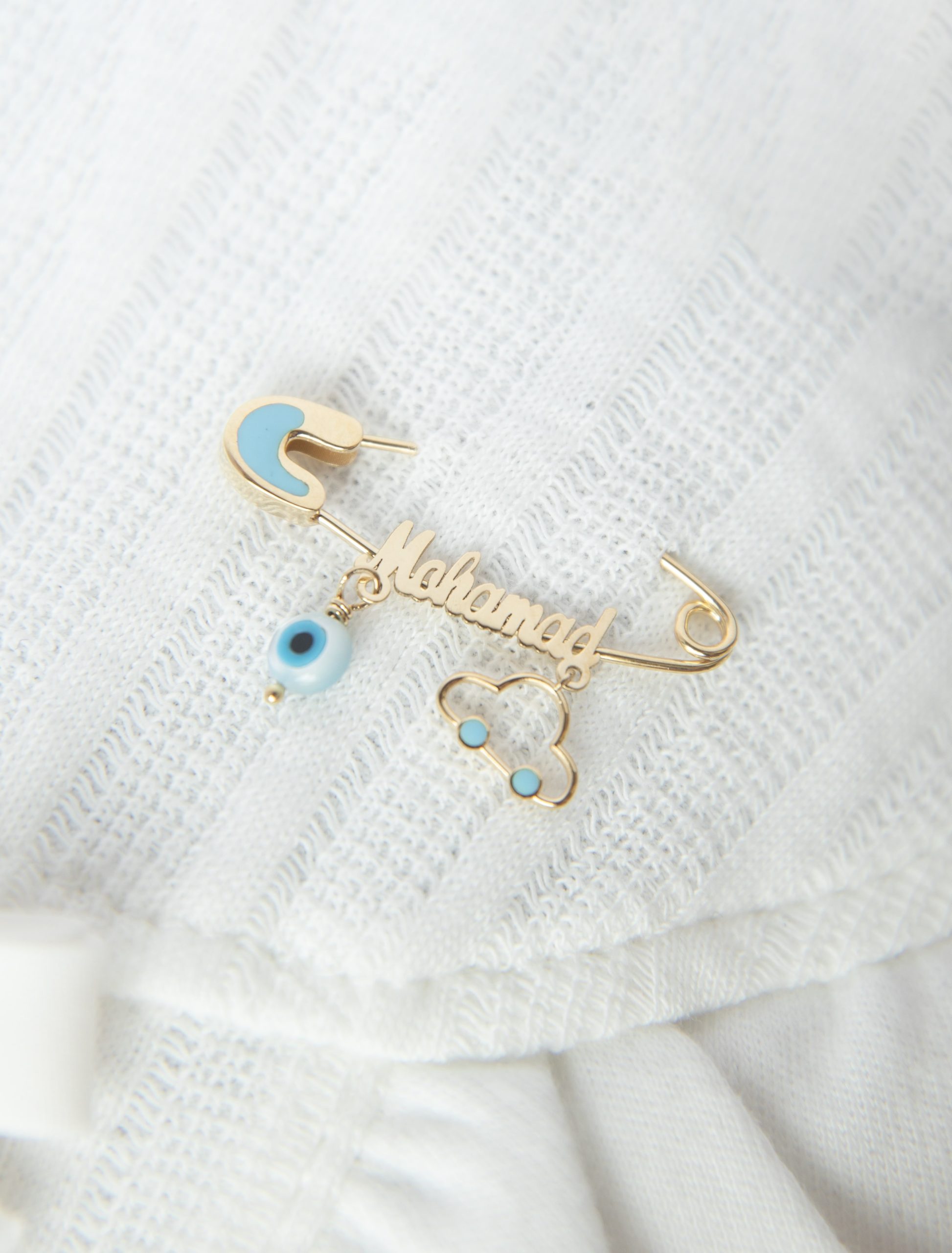 Crafted in 18K gold, this charming newborn safety pin features bright blue enamel and two playful yet protective charms—a cute car and a traditional blue evil eye. A perfect gift for a baby boy, combining fun design with timeless symbolism.