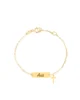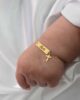 A timeless 18K gold nameplate bracelet designed for newborns, featuring a sleek personalized name plate paired with a delicate cross charm. This meaningful bracelet combines elegance with faith, making it a cherished keepsake for a baby’s first jewelry piece.