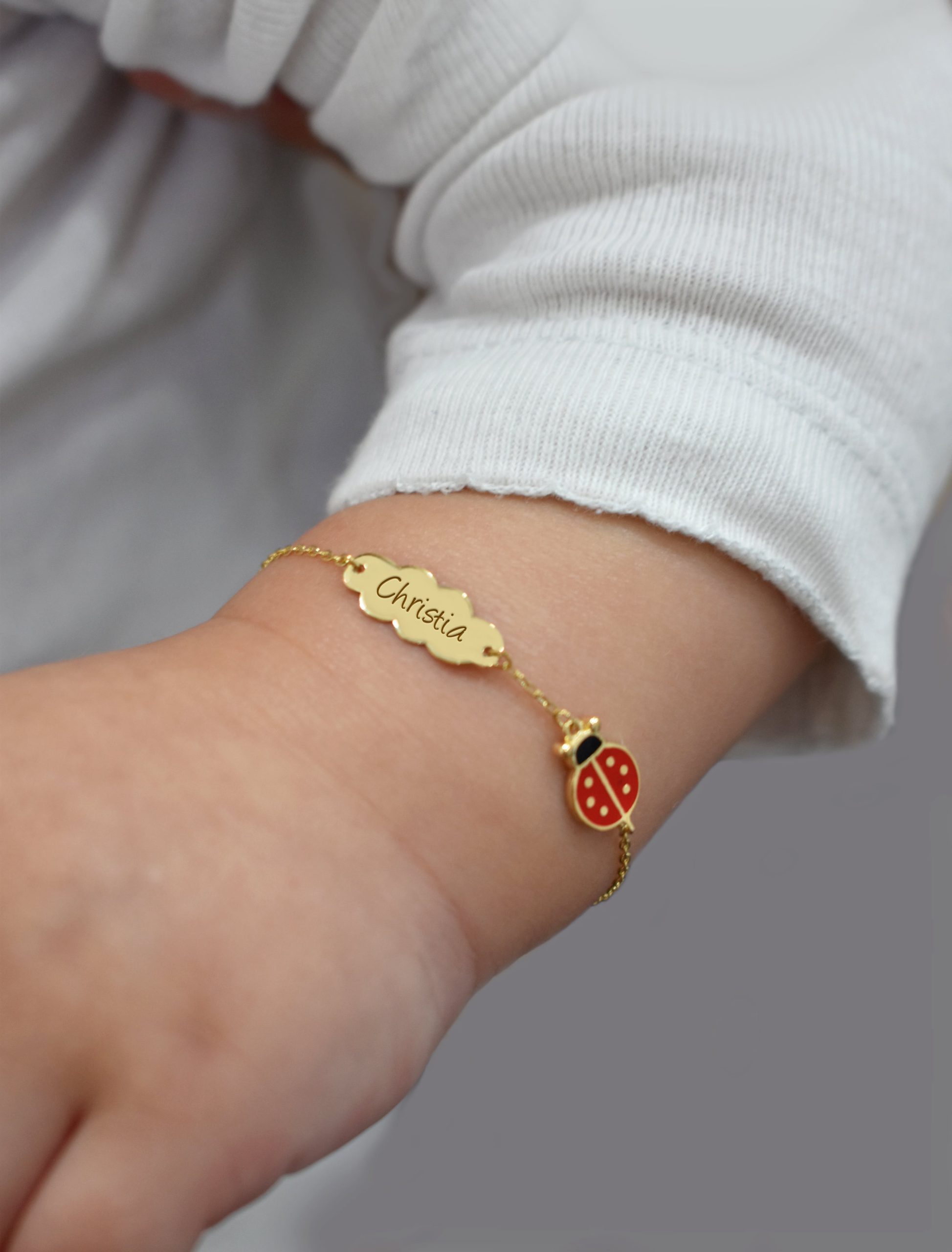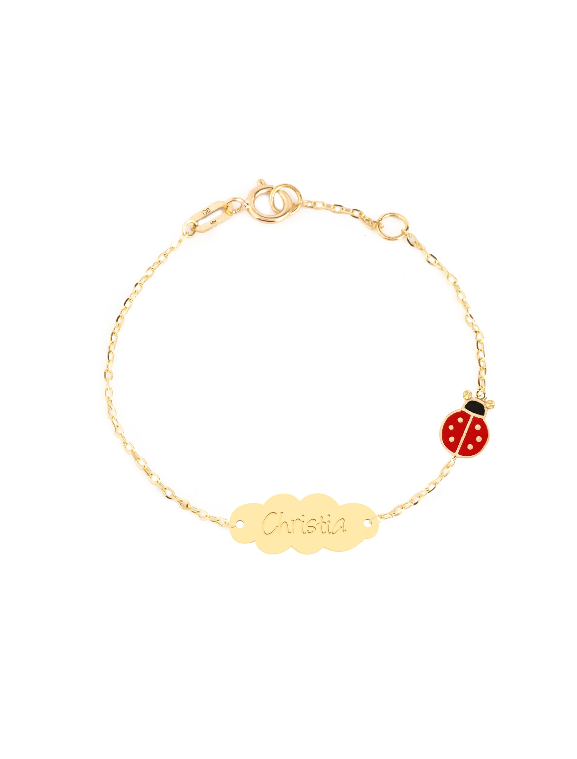 Crafted with love and care, this dainty bracelet features a delicate plate, meticulously engraved with the baby’s name. A whimsical ladybug motif, adorned with vibrant enamel, graces the bracelet and symbolizes good luck and new beginnings. This bracelet is a timeless token of love and a perfect gift idea.