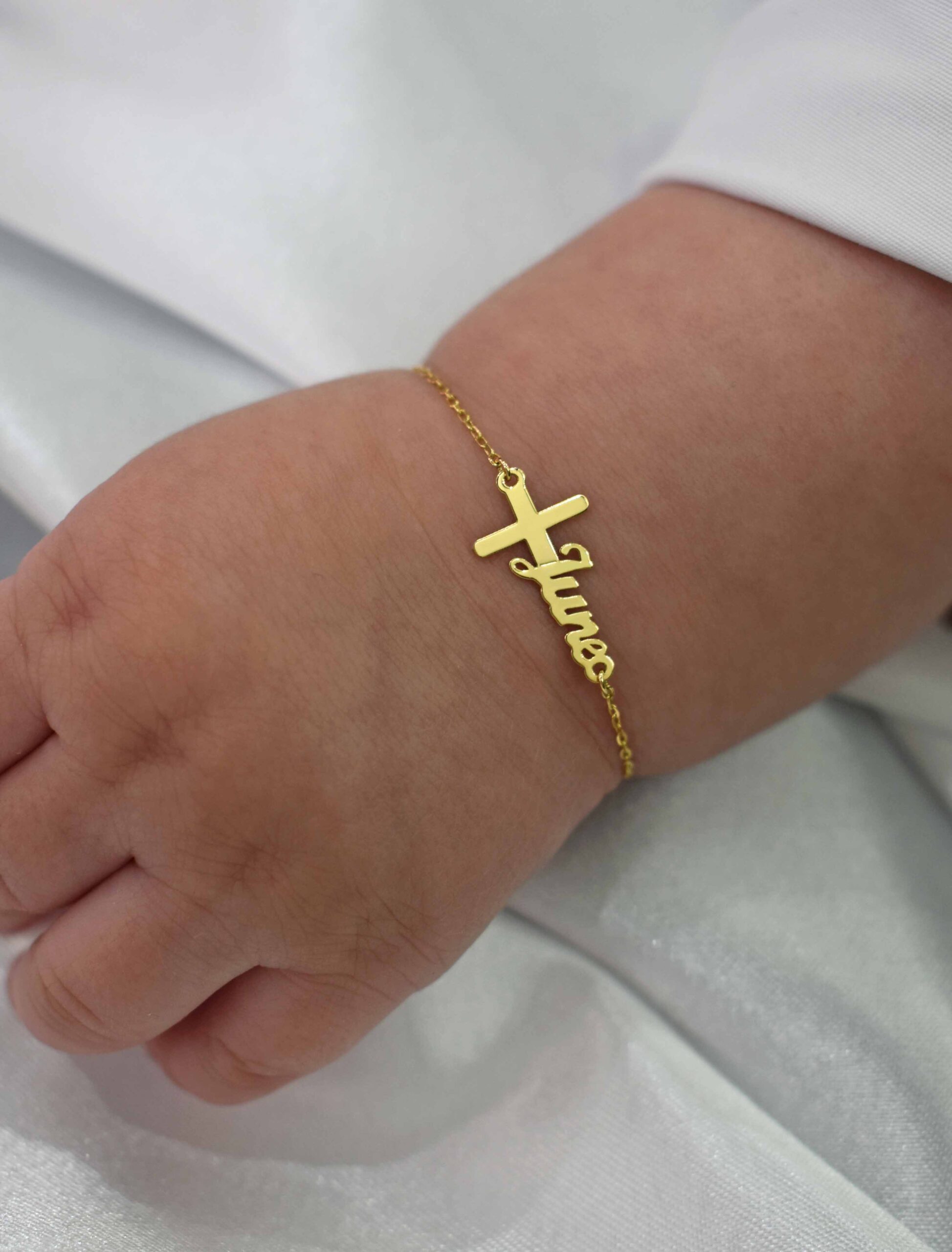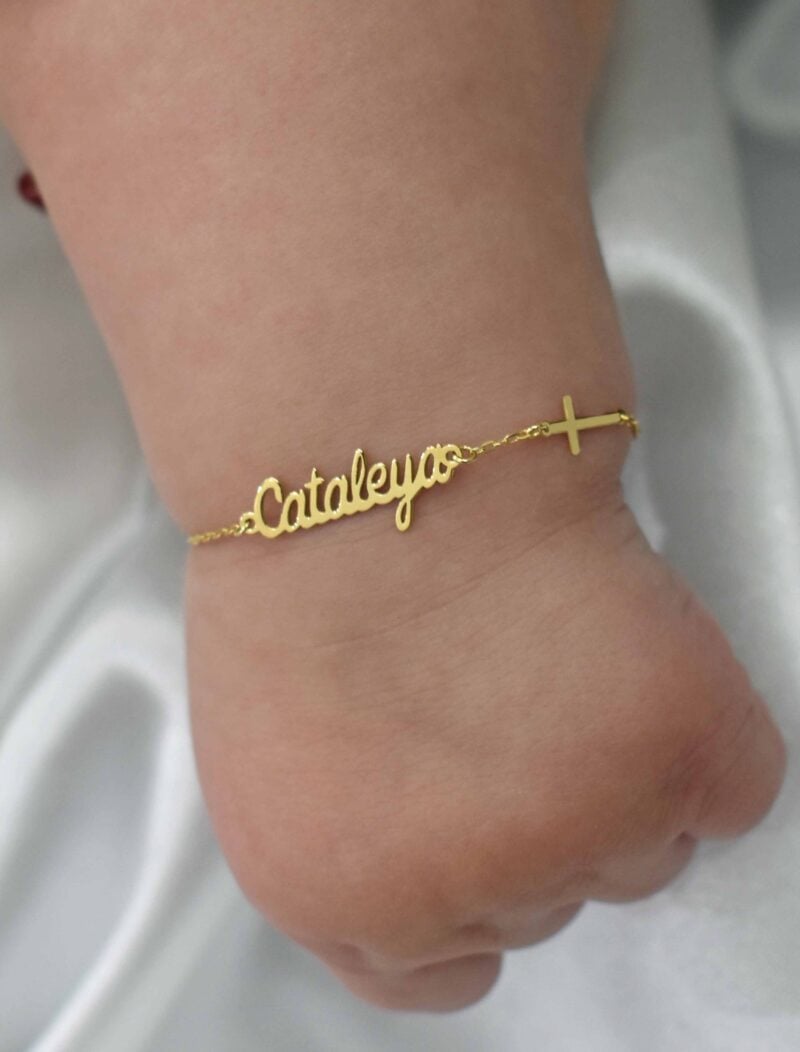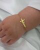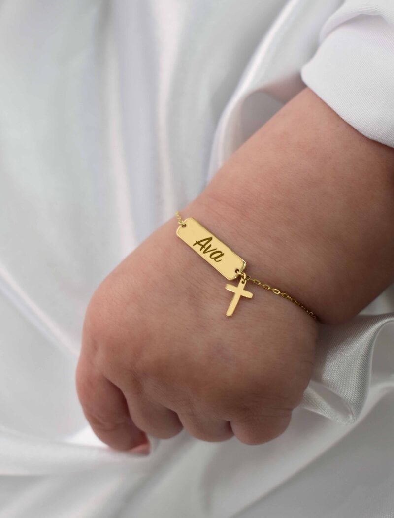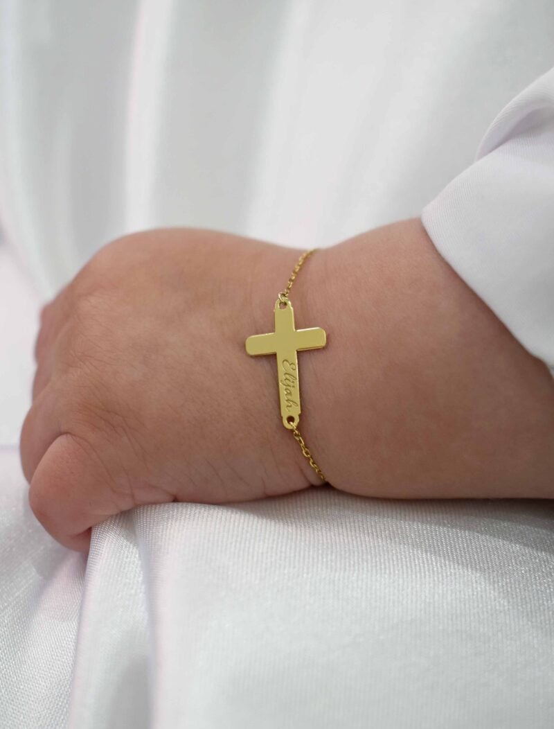 A delicate and meaningful bracelet designed especially for newborns, crafted in solid 18K gold. This personalized bracelet features a beautiful script name design paired with a small cross, symbolizing faith, protection, and love. Its lightweight and elegant style makes it a perfect keepsake gift for newborn babies, ideal for baptisms, christenings, or birth celebrations.