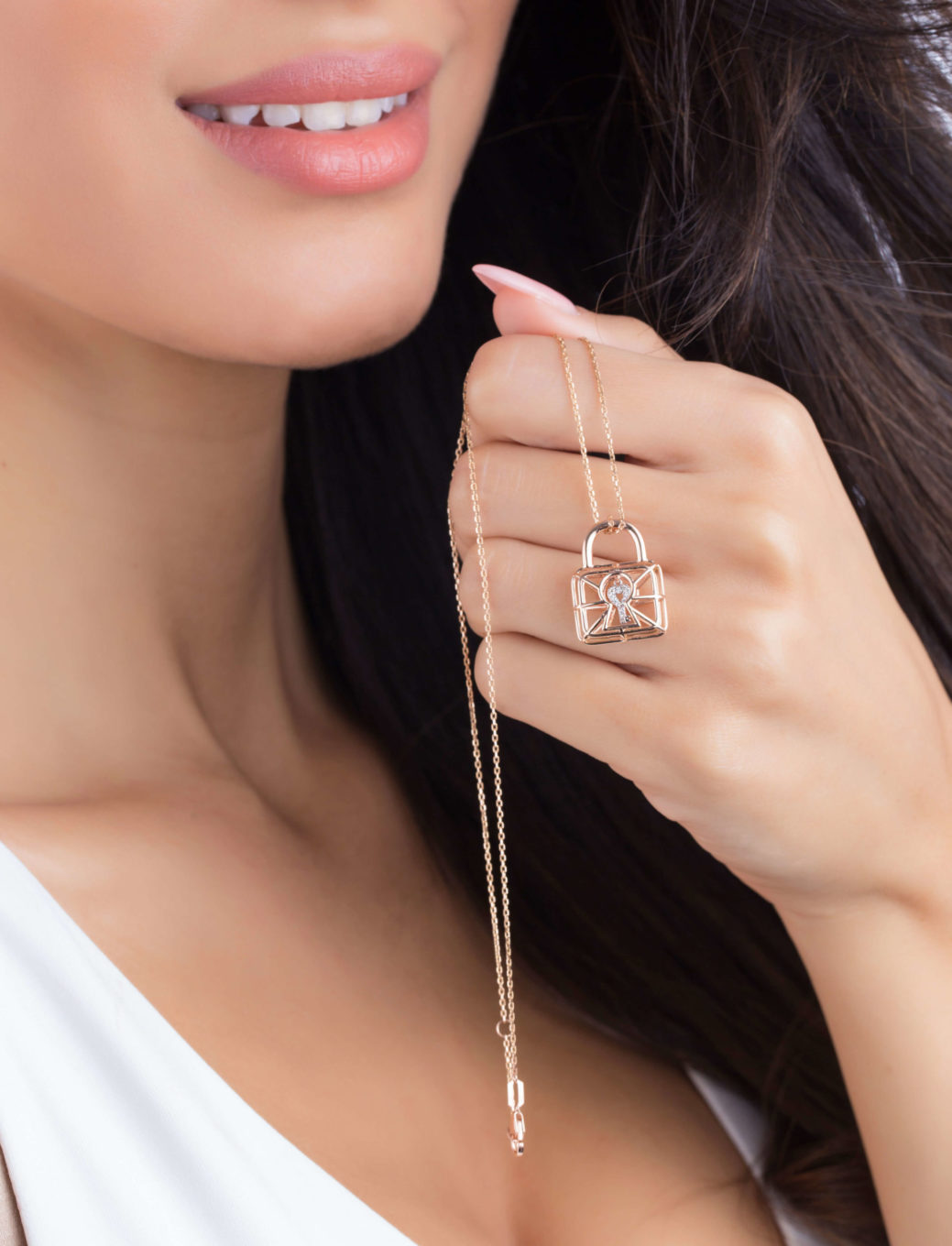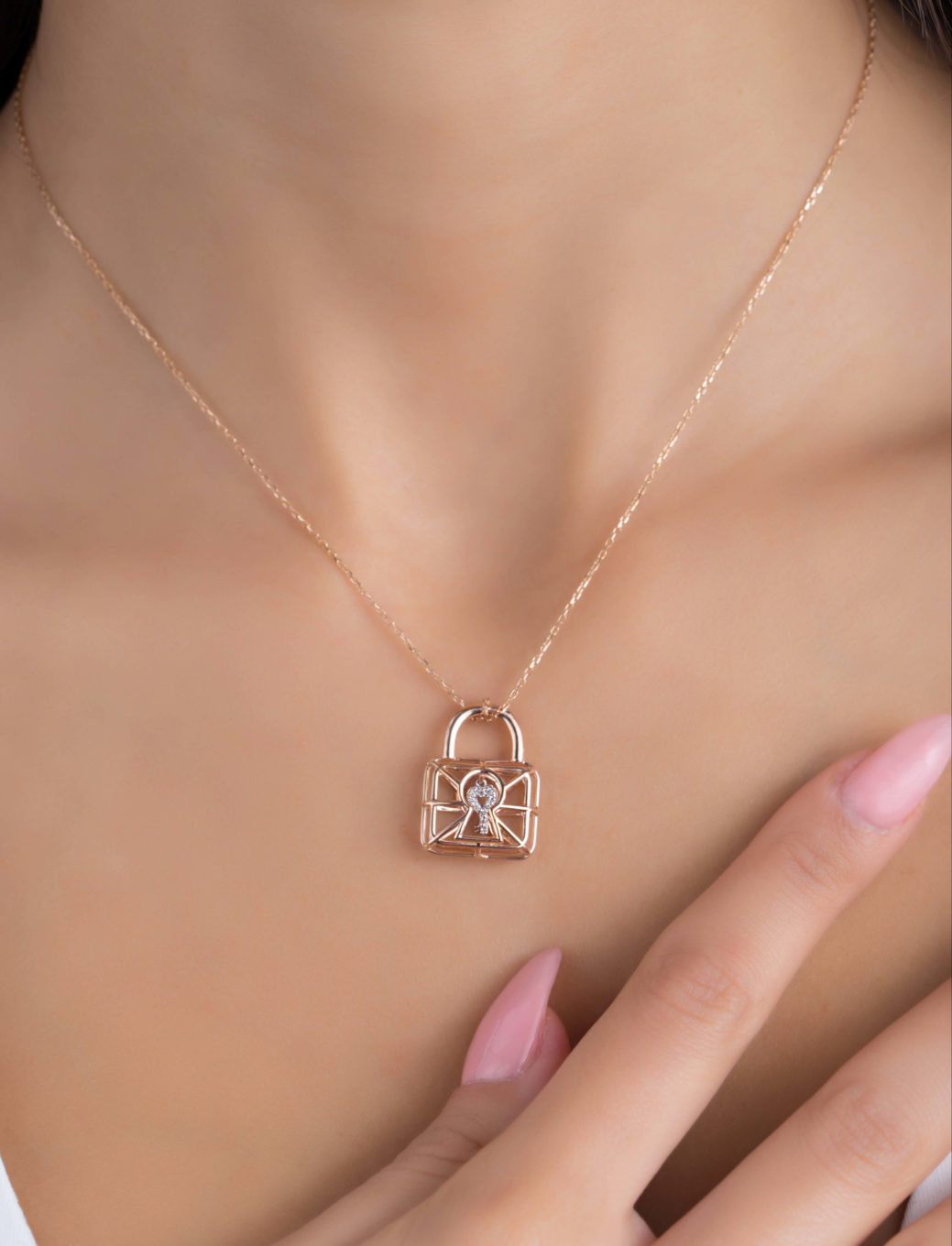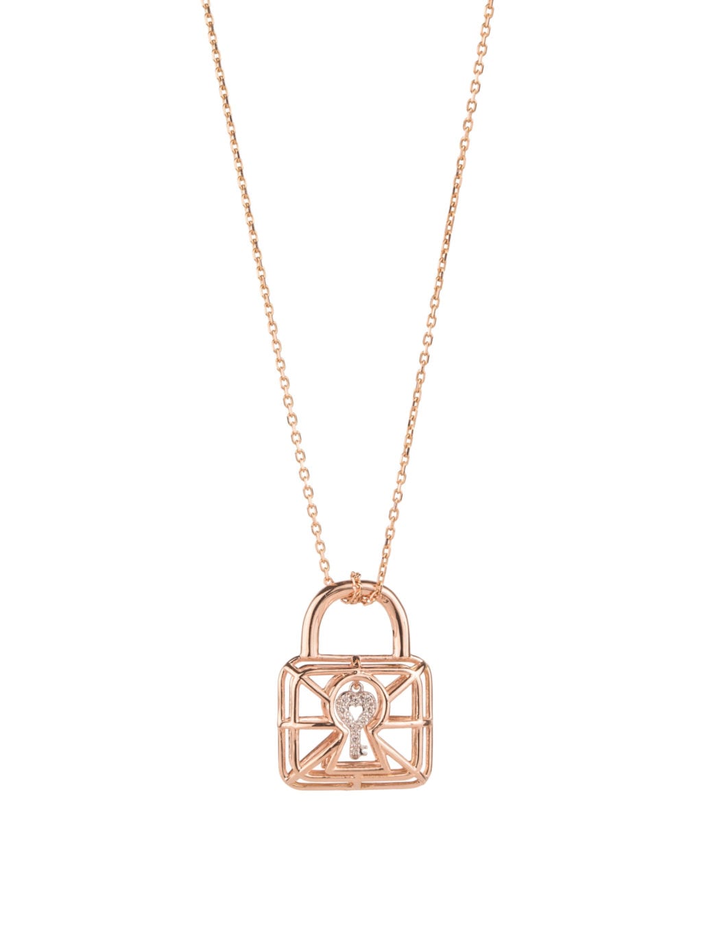 Discover the “Lock Cage Necklace”, featuring a key in white gold, covered with pave diamonds on both sides, waving inside the expertly crafted and uniquely designed 3D rose gold lock cage. Meticulously crafted to float gorgeously upon the skin, it radiates beauty, elegance and feminine power. Get it for yourself or as an iconic gift to a special someone.