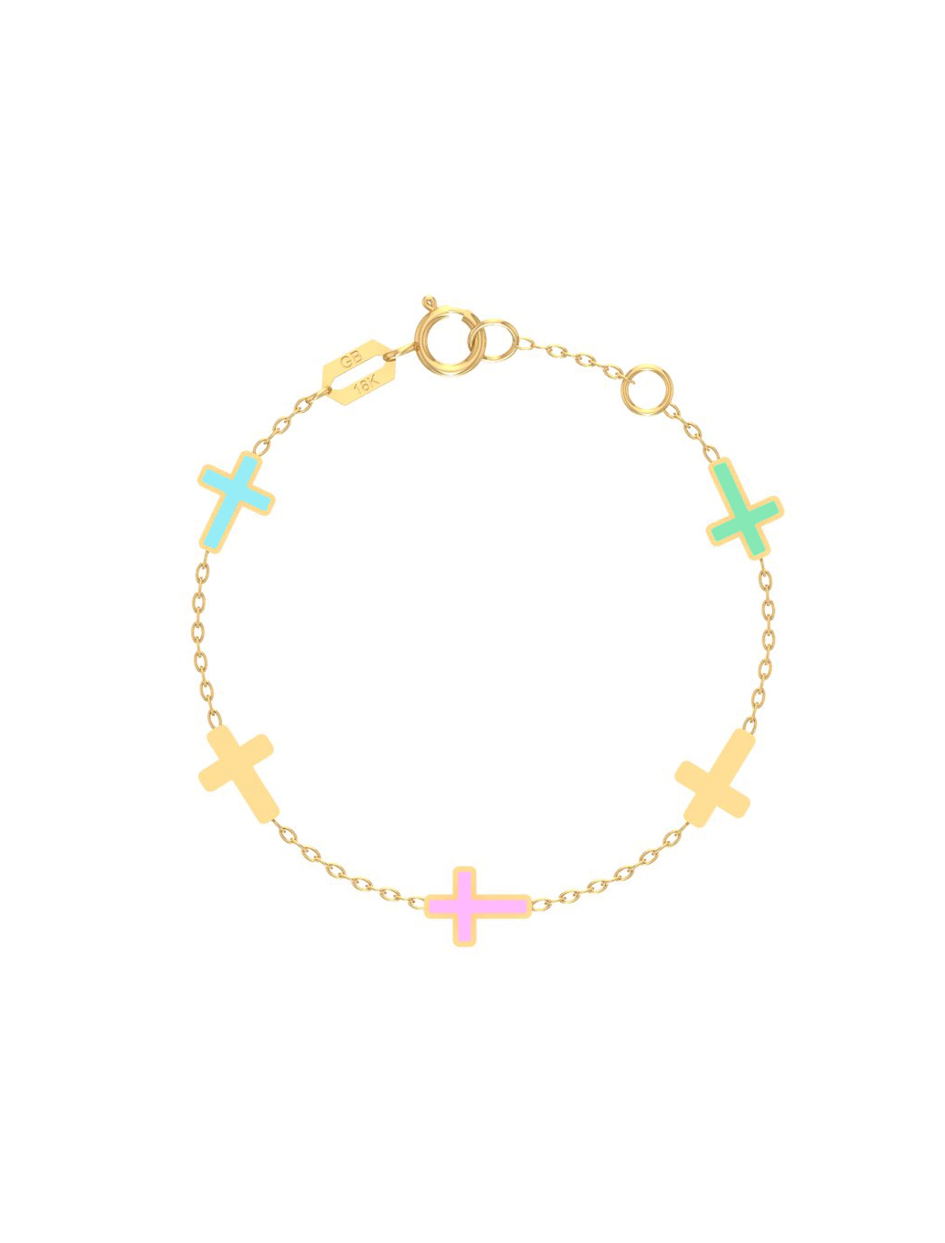 A delicate 18K gold bracelet featuring multiple crosses, designed especially for newborn babies. The soft pastel enamel details add a playful and elegant touch while the crosses symbolize faith and protection. This bracelet makes a beautiful keepsake gift for baptisms, christenings, or newborn celebrations.
