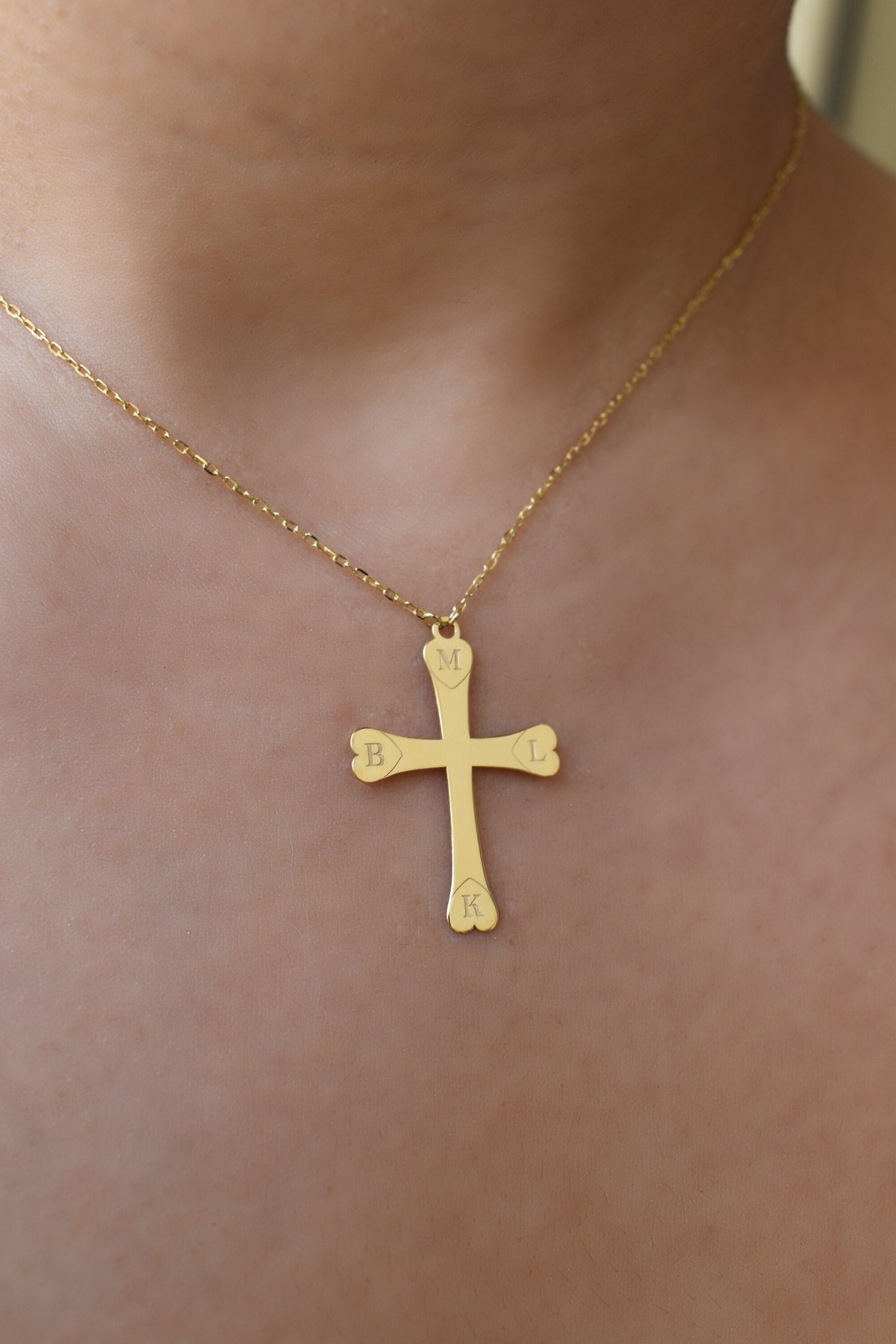 Crafted in radiant 18K gold, this cross necklace features delicate initials to represent your loved ones—creating a meaningful symbol of love, connection, and belief you can wear close to your heart.
