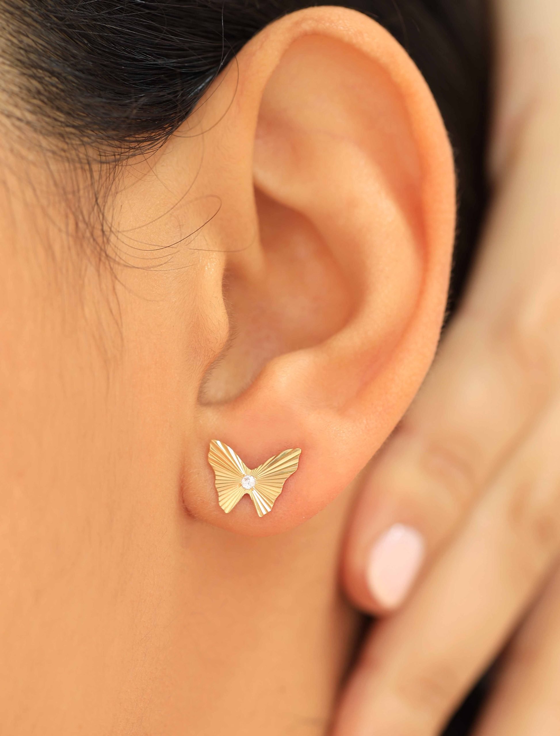 Light, playful, and full of charm. These fluted 18K gold butterfly earrings showcase softly textured wings with a brilliant zircon stone shining at the center.