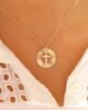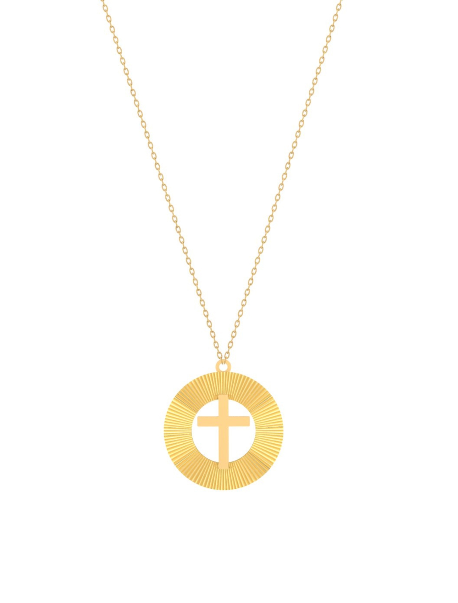 Grace meets timeless design in the 18K Gold Fluted Cross Frame Necklace. This meaningful piece features a beautifully crafted open circular pendant with a fluted texture, symbolizing eternity and strength. At its center, a delicate cross is embedded, adding a sacred touch of faith and light.