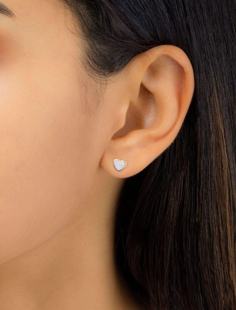 These cute earrings feature hand applied enamel hearts that are adorned with diamonds for extra sparkle. Get them to yourself or a special someone in your life as a perfect match to any outfit!