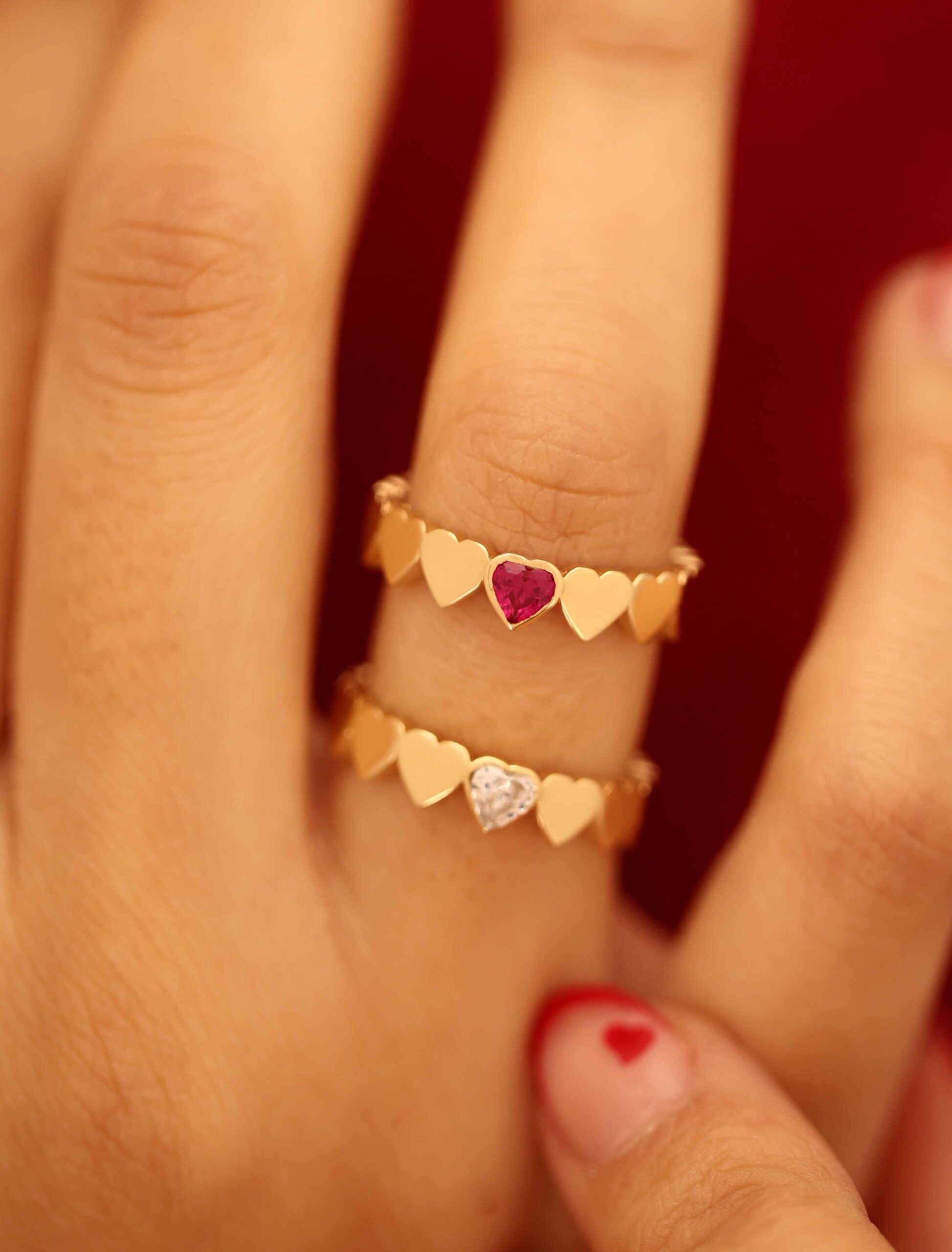 This 18K Gold Heart Eternity Ring is a circle of devotion — a band formed entirely of interlocking hearts, each one a testament to love that grows, surrounds, and endures. At the center sits a sparkling heart-shaped CZ stone, the brightest point in the ring, symbolizing the heart of the story: the love that anchors everything.