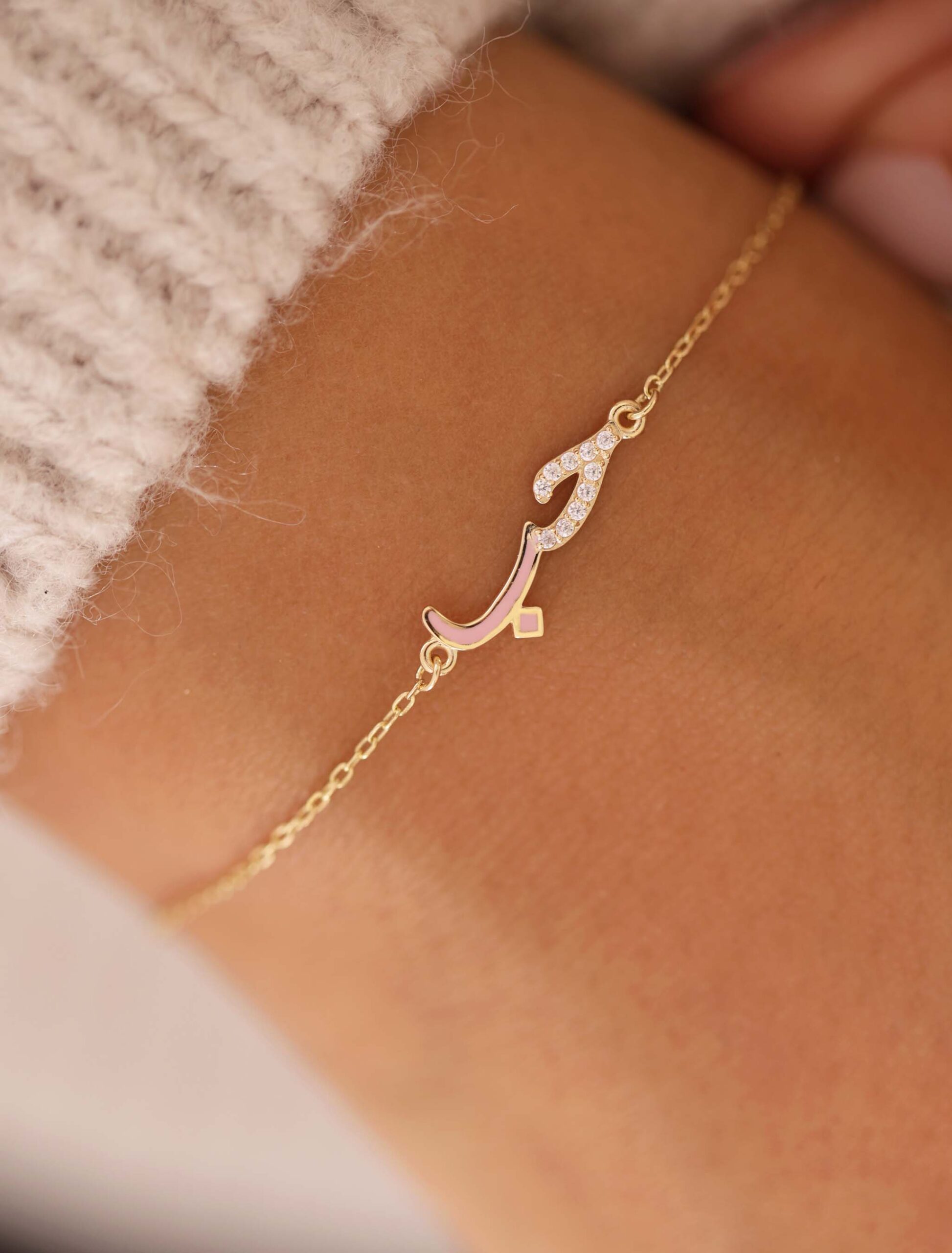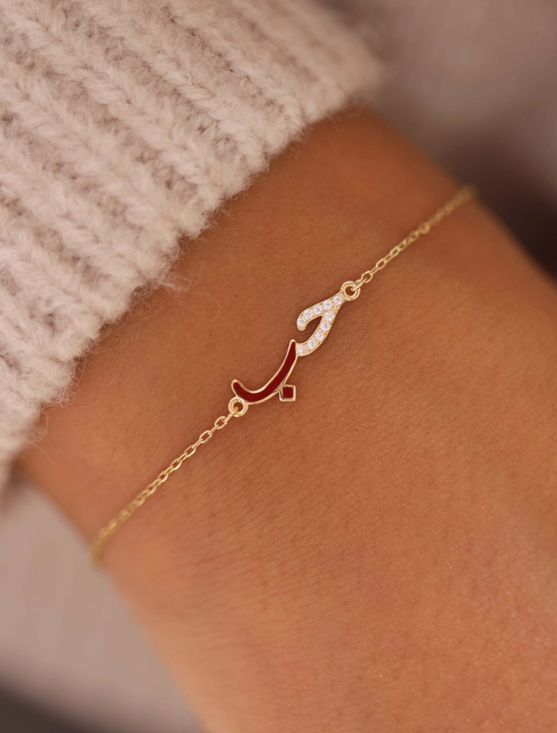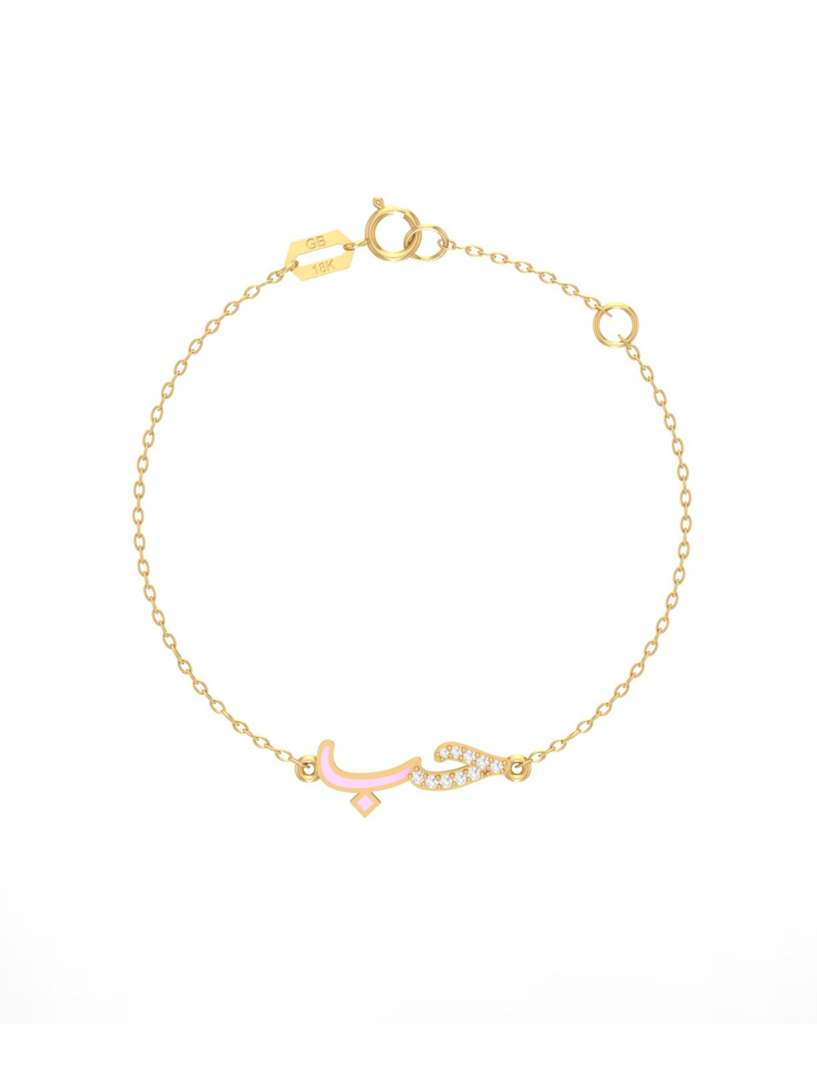 Celebrate love with our Hobb Bracelet, a modern tribute to the Arabic word “”حب”” (Hobb) — meaning love. Crafted in 18K gold, the design features the letter “”ح”” adorned with shimmering zircon stones, while the letter “”ب”” is accented with rich enamel detailing.
