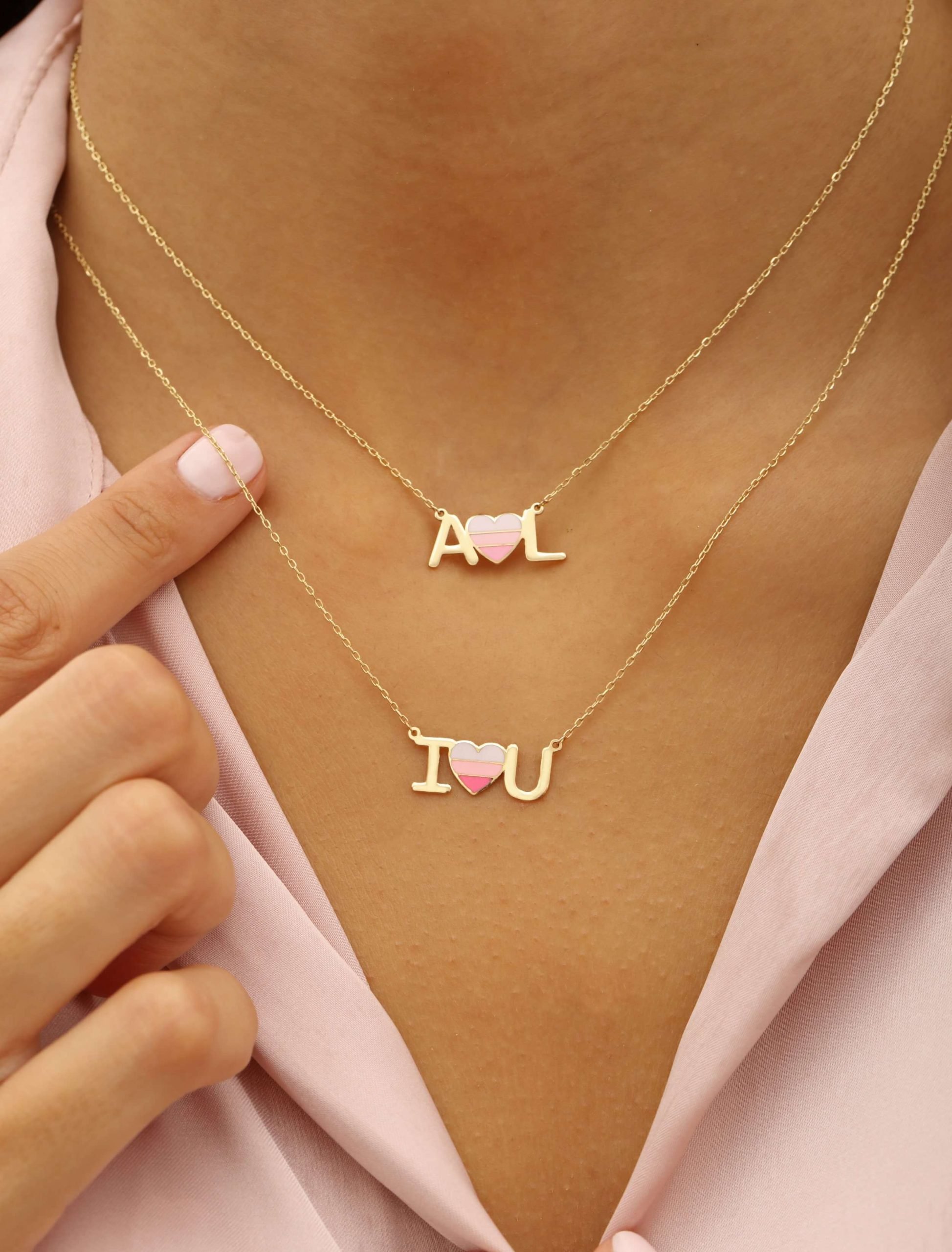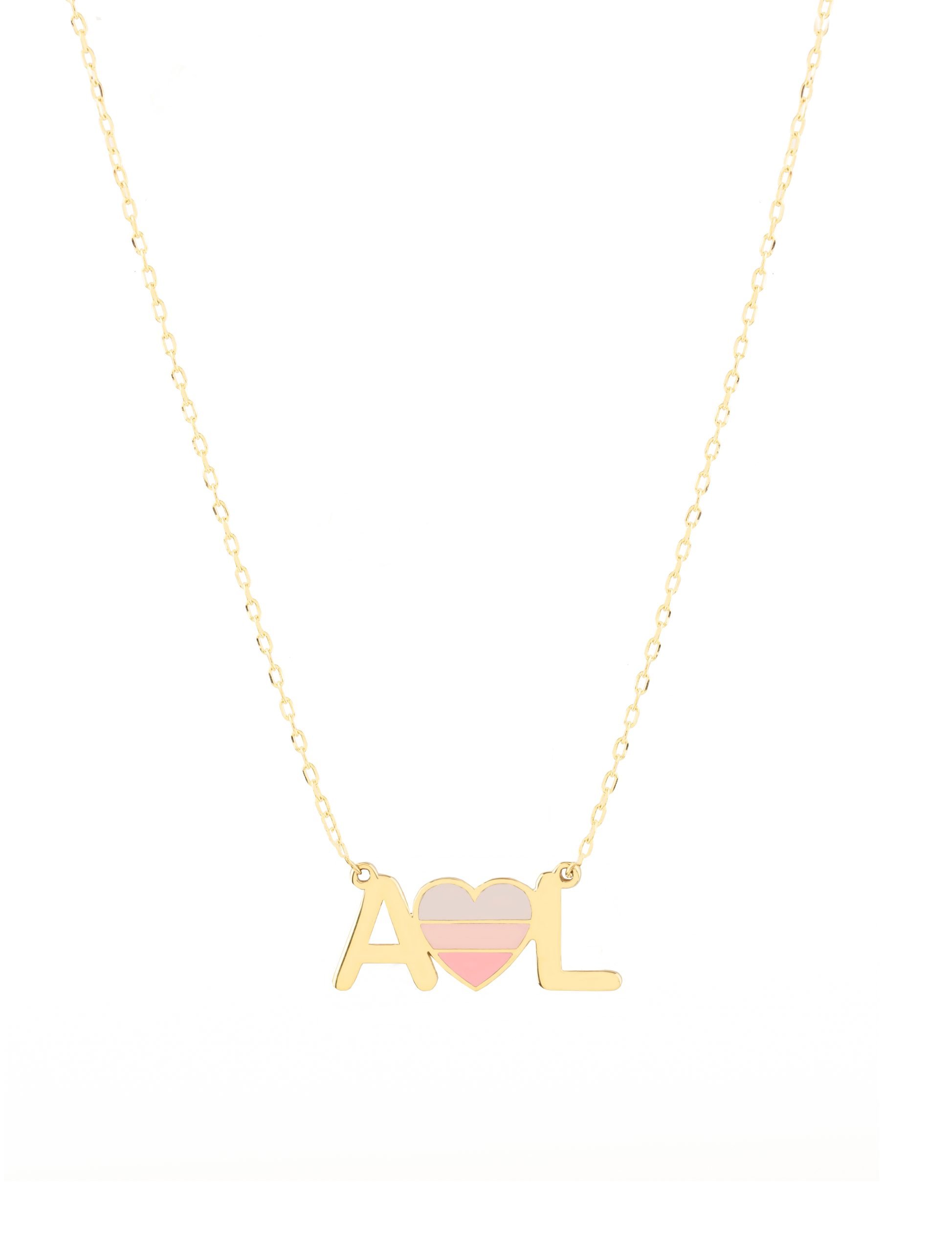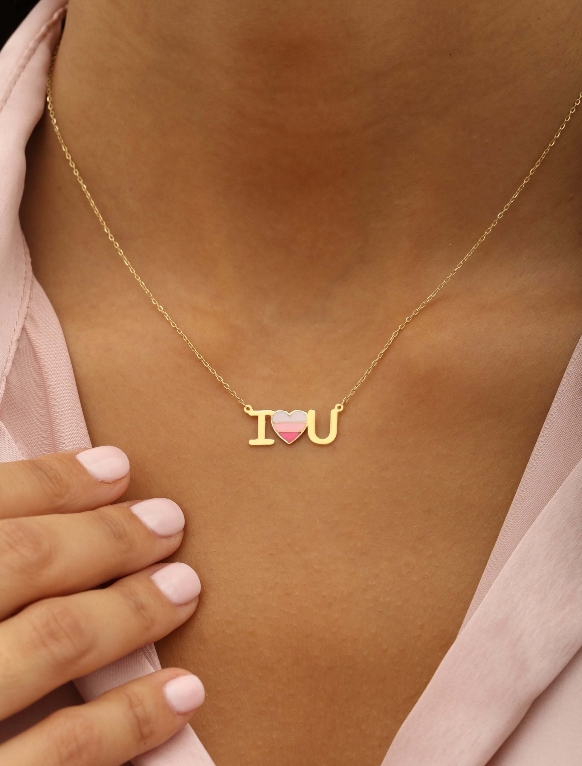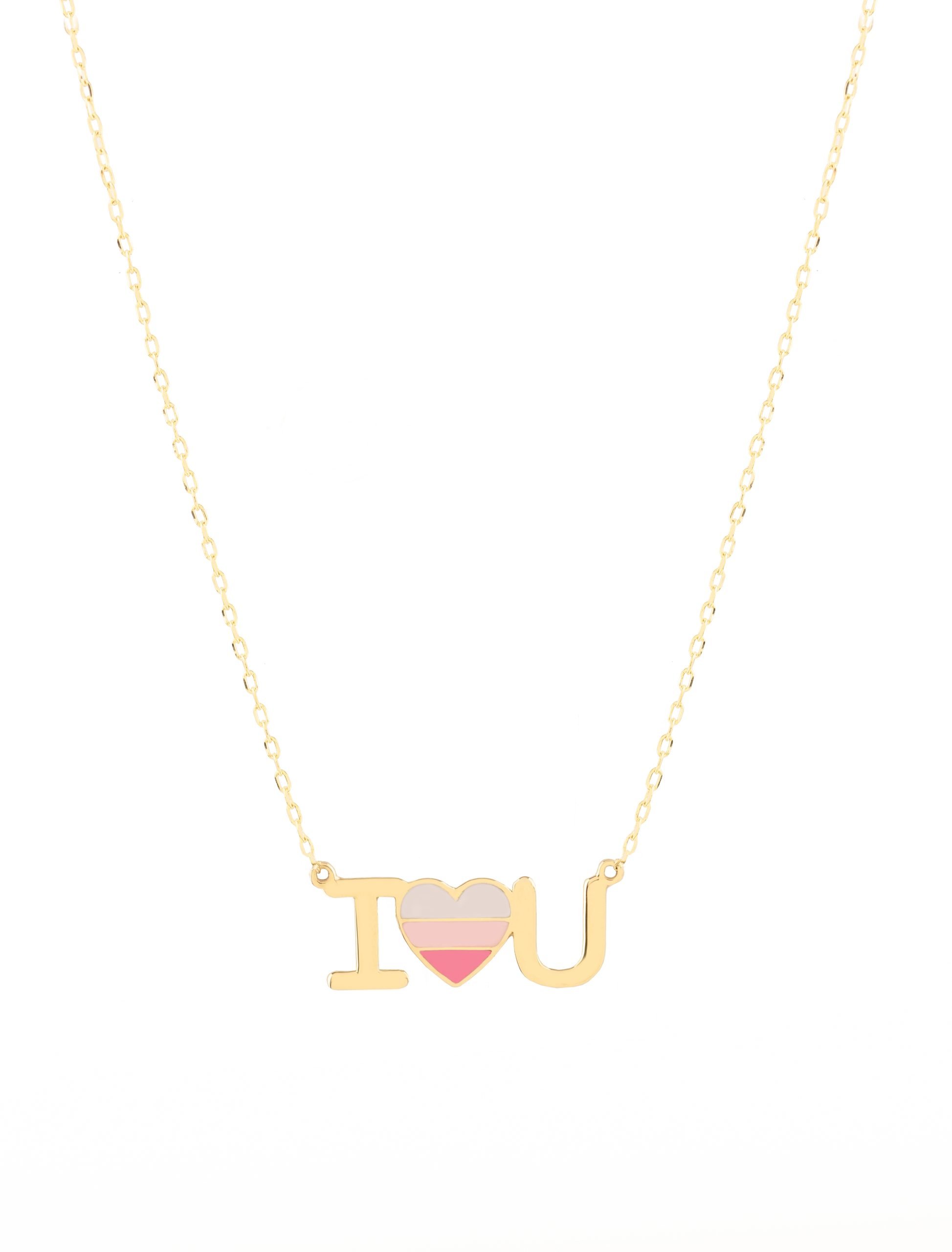This exquisite 18K gold necklace features a delicate pendant that spells out I Love You. Crafted with meticulous attention to detail, it features a heart in the centerpiece adorned with three shades of pink. This necklace is ready to make a meaningful impression on Anniversaries, Valentine’s Day, or any occasion where you want to express your true feelings of love and affection. You can customize it with special Initials as well!