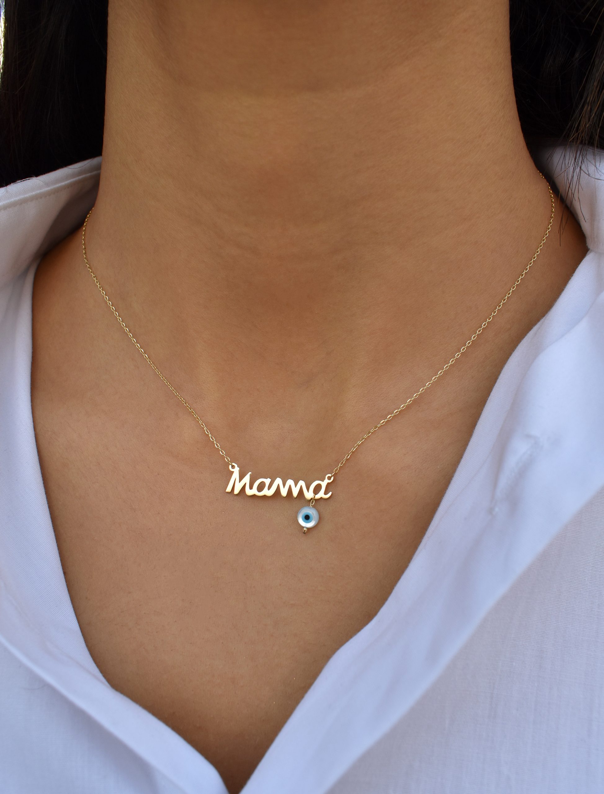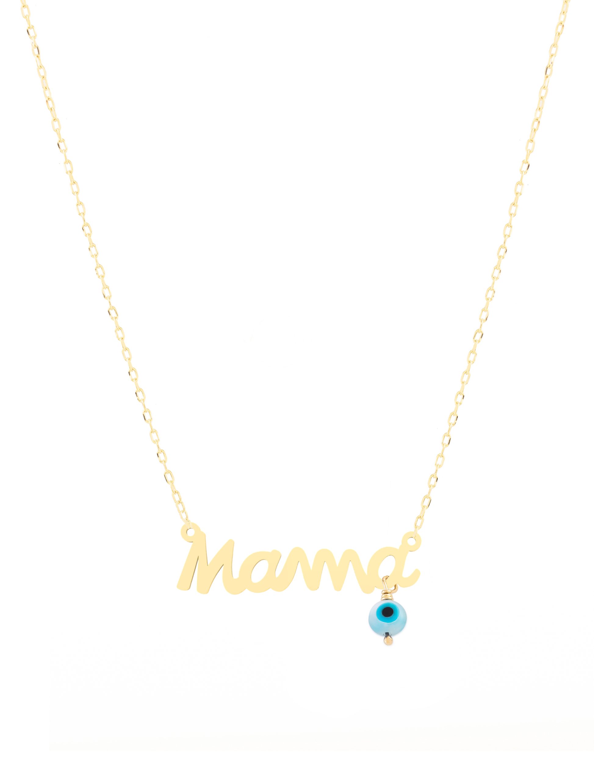 Crafted in 18K gold, this necklace features a stunningly scripted “Mama” word and a protective dangling Evil Eye bead. This exquisite piece is a versatile and meaningful keepsake that celebrates motherhood, making it the perfect gift for the remarkable women in your life.