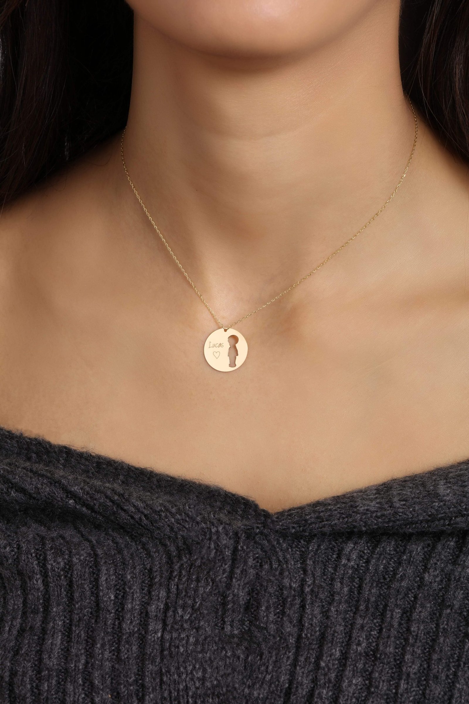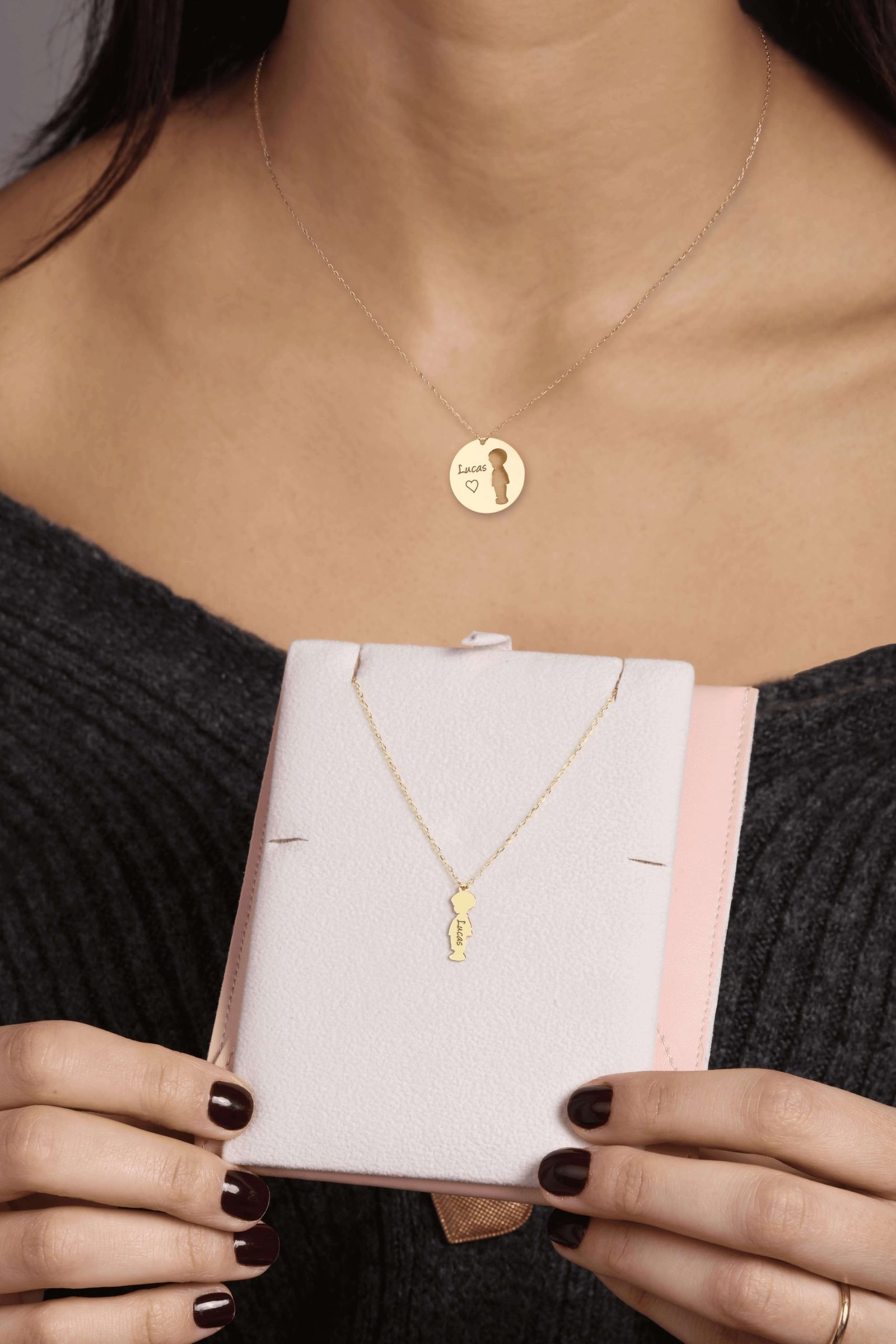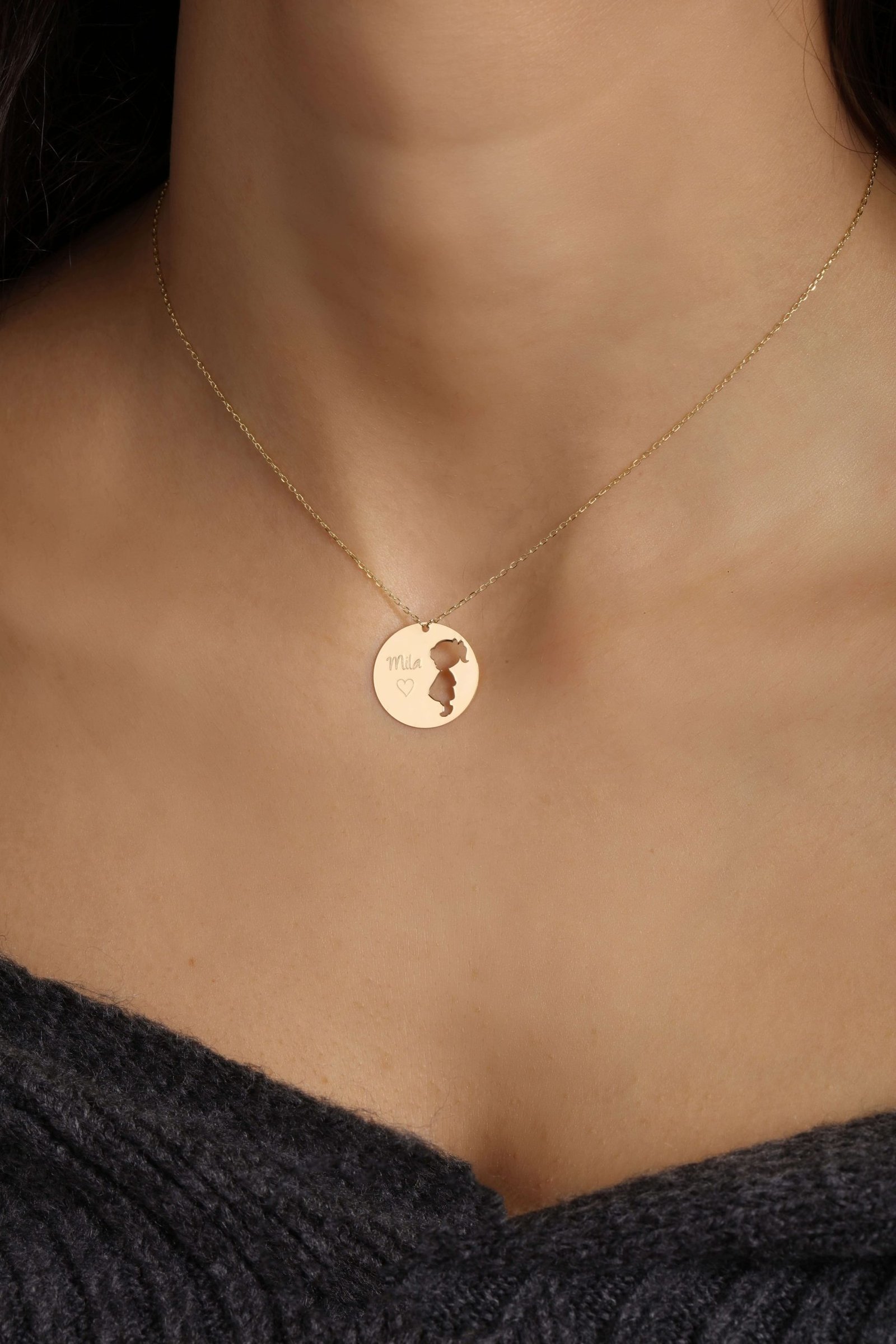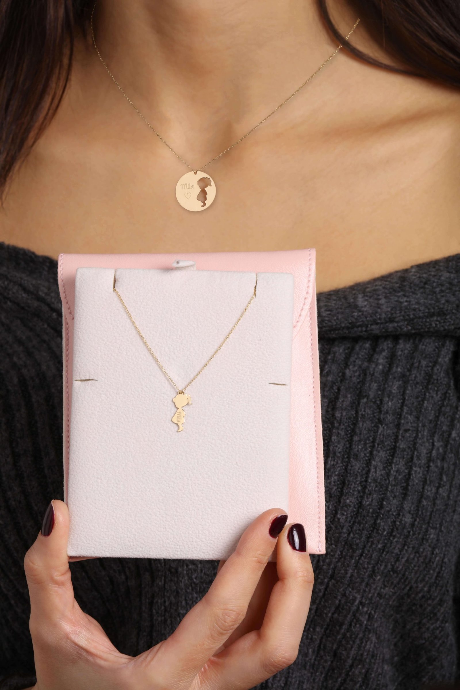 This beautiful matching 18k gold necklace set is the perfect way for a mom and her little one to share a special bond. The mom’s necklace features a circle with a cut-out design of her baby, either boy or girl, and the baby’s name engraved. The baby’s necklace is shaped as a boy or girl silhouette, with their name delicately engraved. This heartfelt set is a timeless and meaningful way for both mom and baby to carry a reminder of their unique connection.