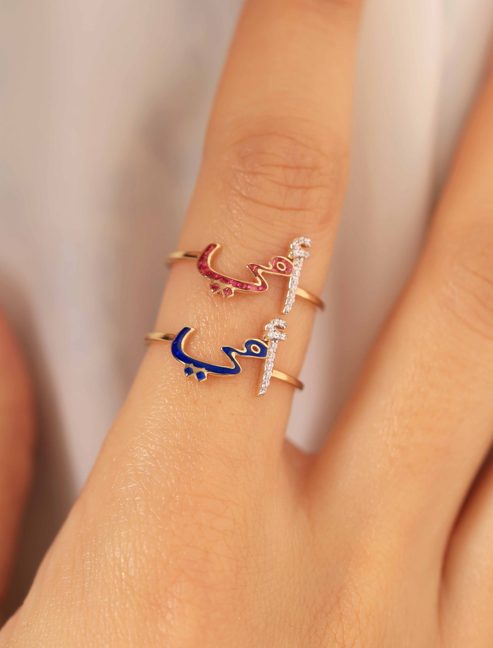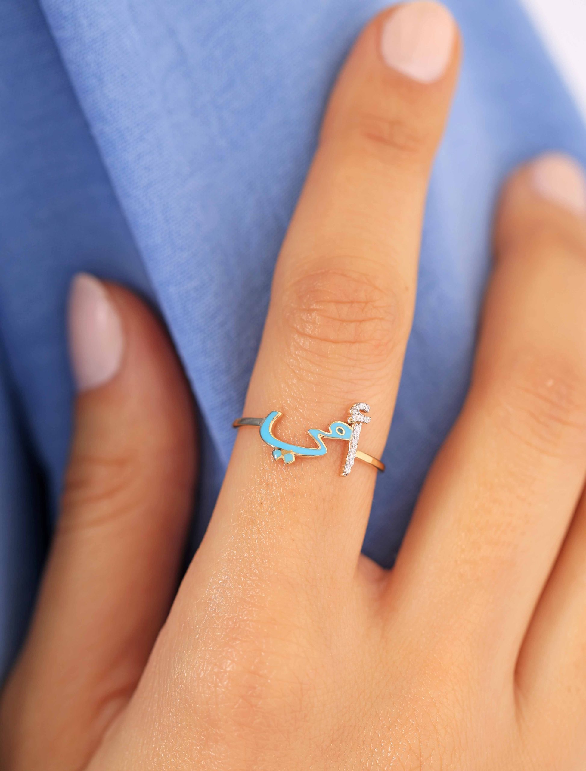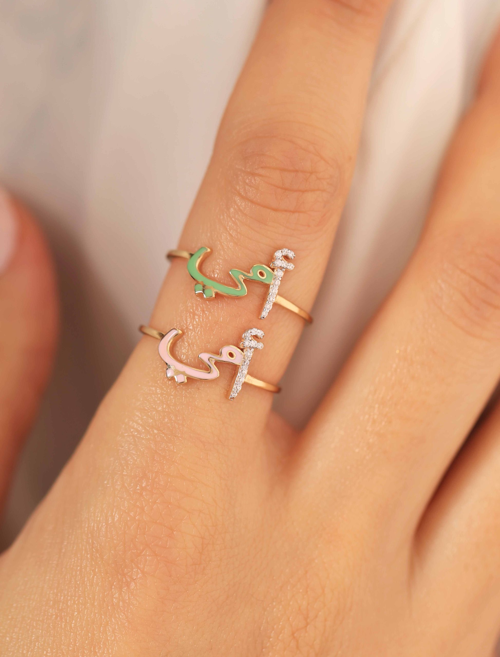 Crafted in radiant 18K gold, our “أمي” Ring is a heartfelt tribute to Mom. The letter أ sparkles with delicate zircon stones, while مي is beautifully finished in enamel, available in your color of choice.