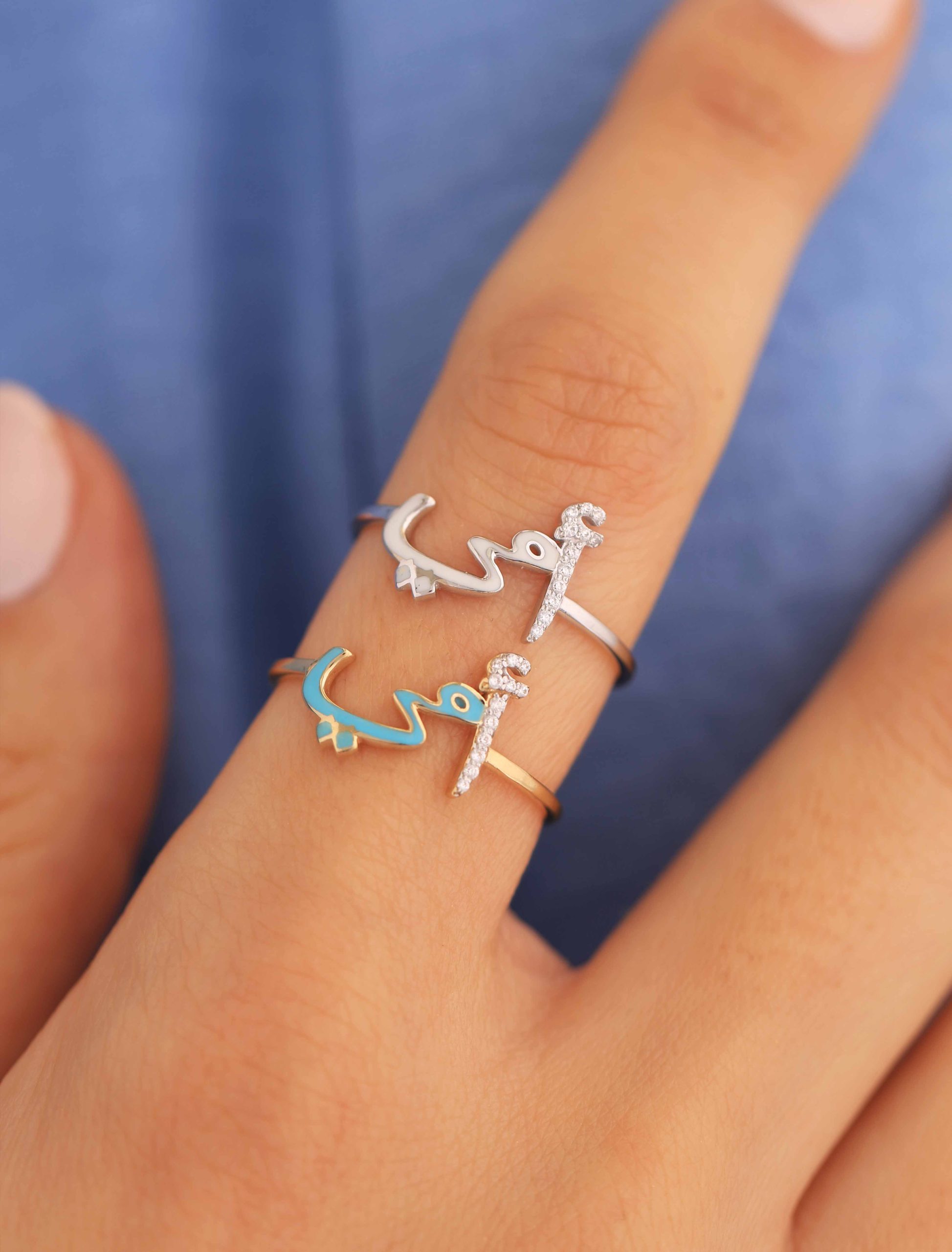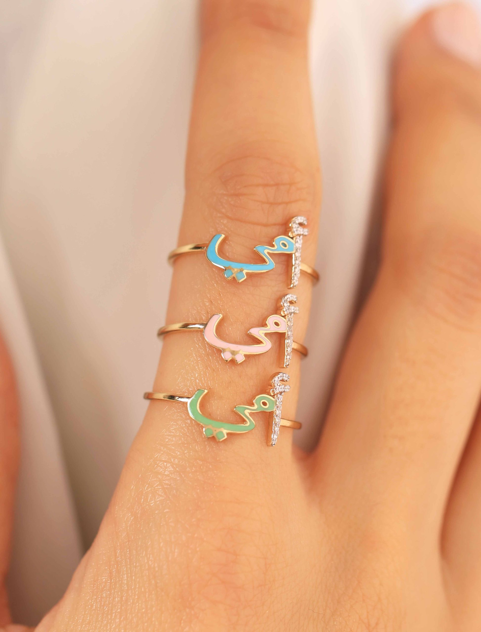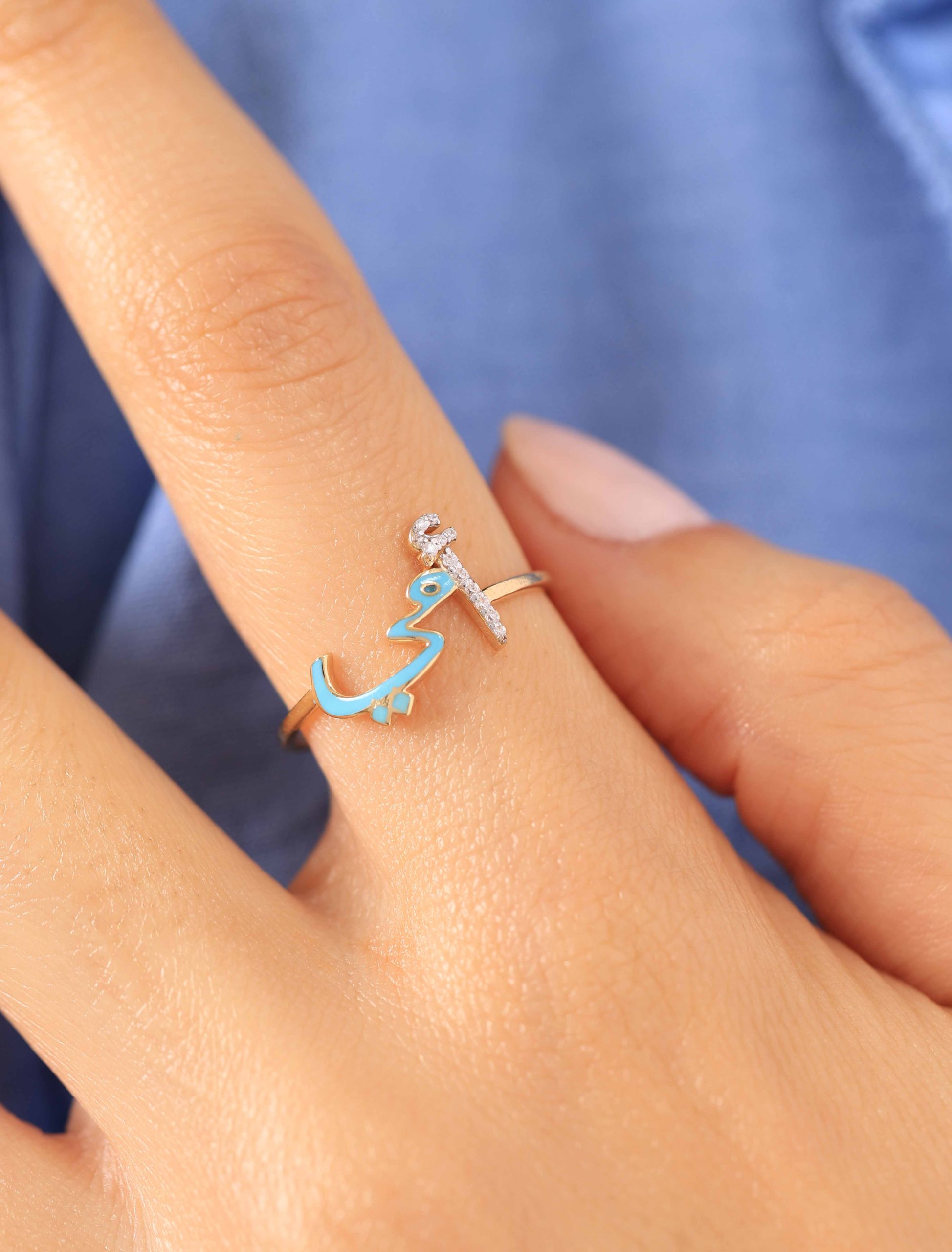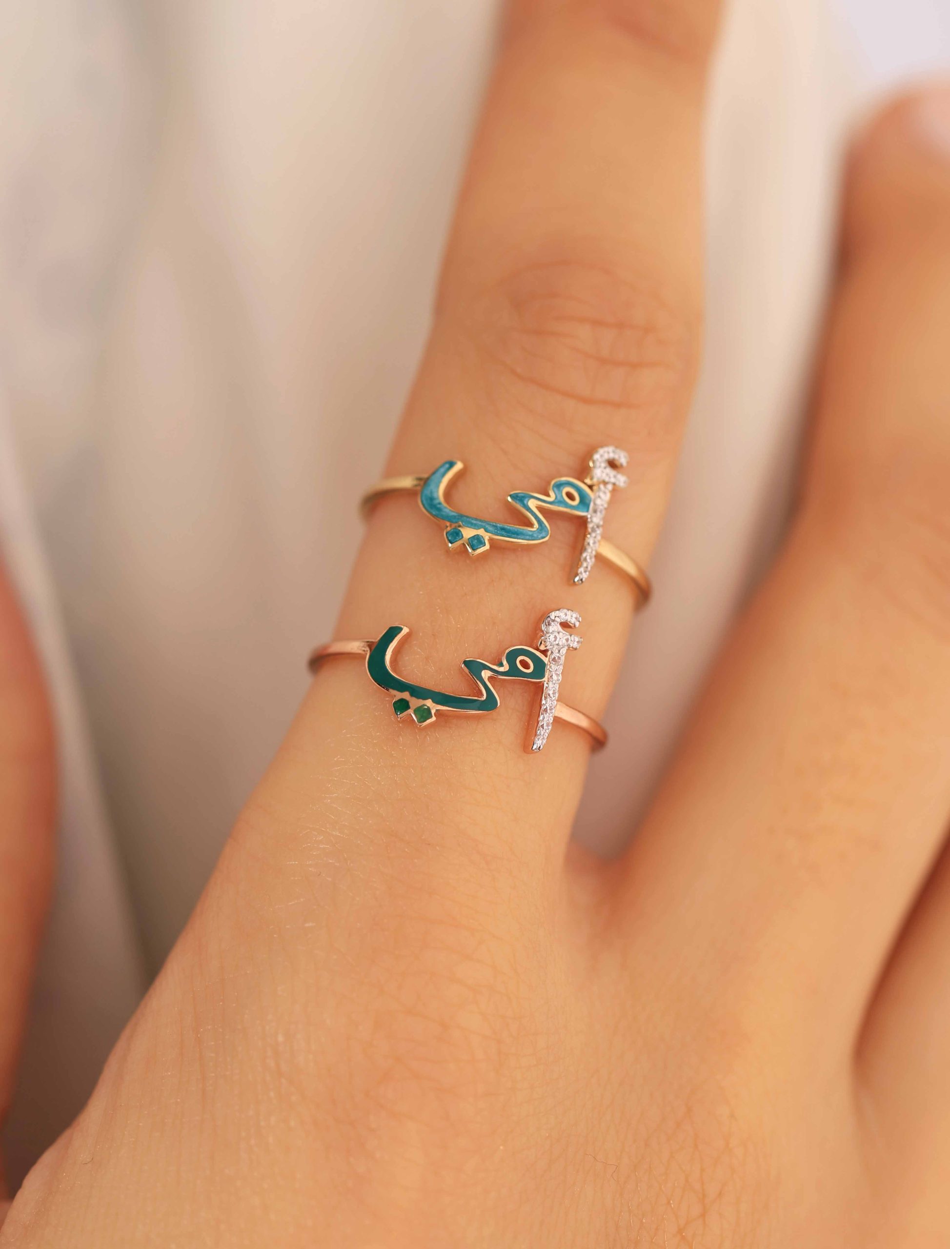 Crafted in radiant 18K gold, our “أمي” Ring is a heartfelt tribute to Mom. The letter أ sparkles with delicate zircon stones, while مي is beautifully finished in enamel, available in your color of choice.