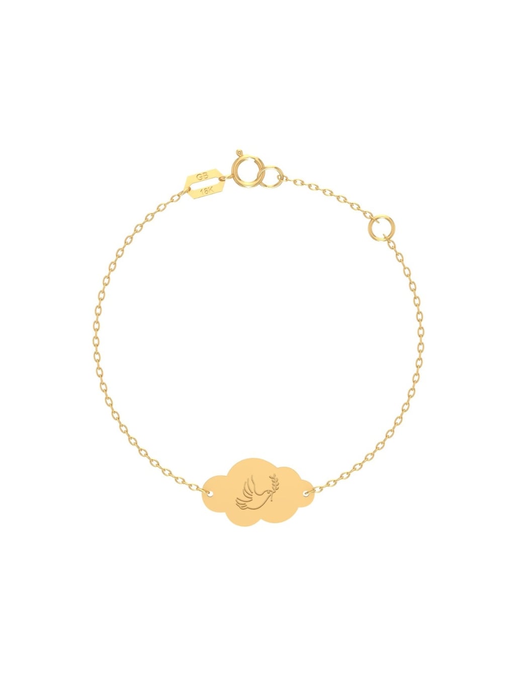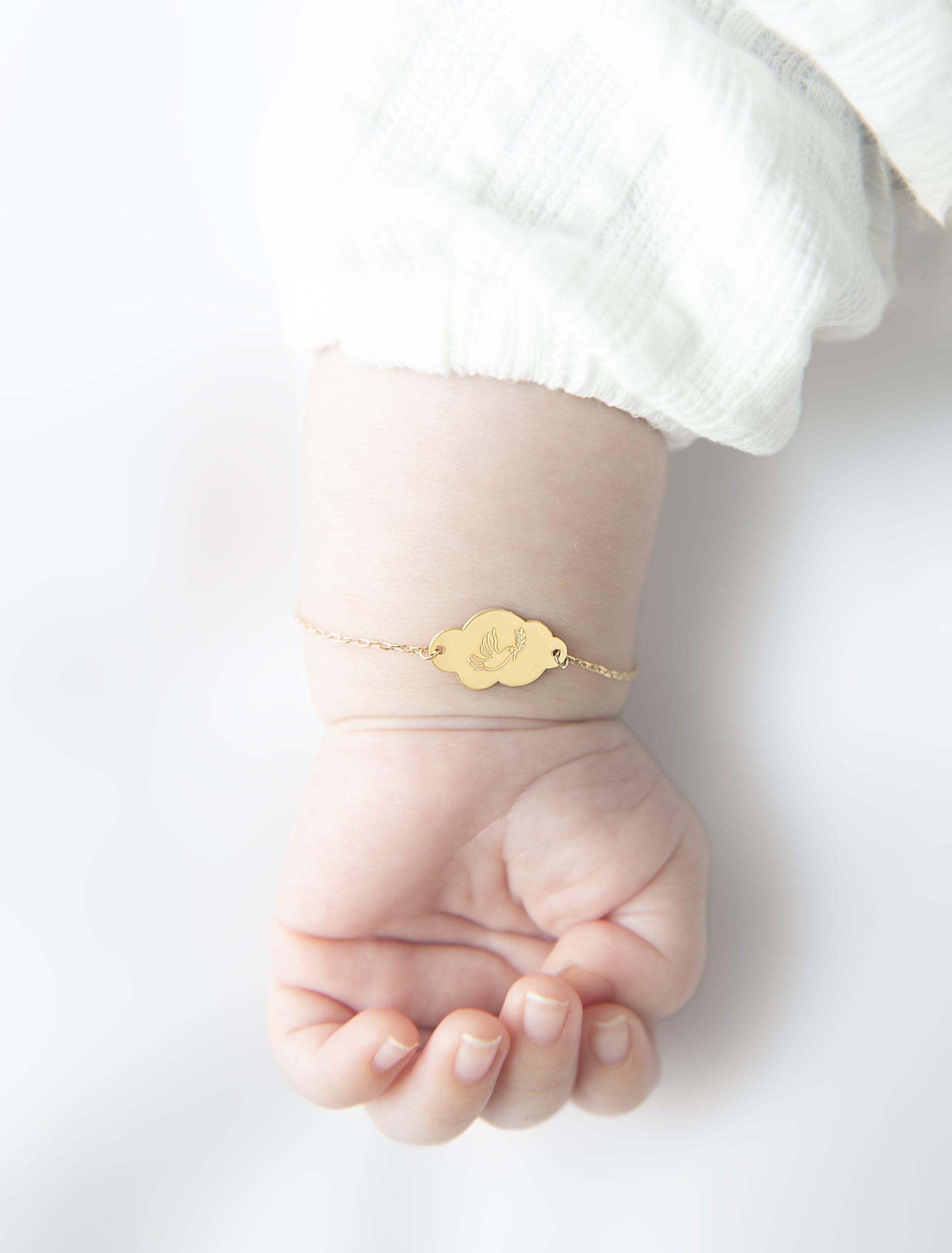 This elegant 18k gold newborn bracelet features a delicate cloud plate engraved with a dove holding an olive branch, symbolizing peace and hope. Crafted for comfort and style, this bracelet is a perfect keepsake to celebrate your little one’s peaceful beginnings and the promise of a harmonious future.