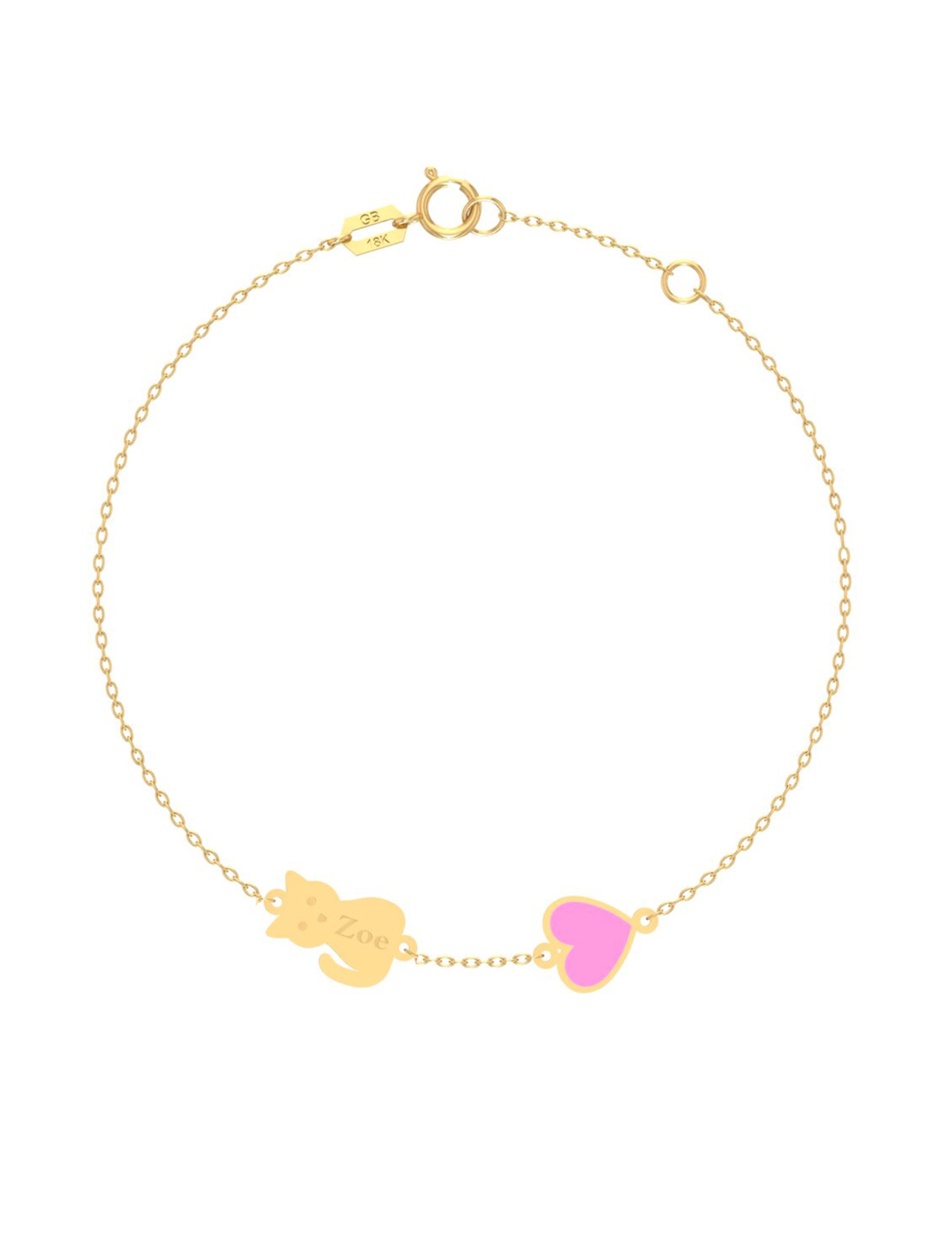 This charming 18k gold bracelet is a must-have for pet moms! Featuring a cute cat or dog charm, the bracelet is adorned with a heart that’s beautifully embellished with enamel in either blue or pink, based on your pet’s gender. A perfect gift for yourself or a fellow pet lover, this elegant piece combines style and your love for your furry friend. Show off your bond in a truly special way with this heartwarming accessory..