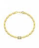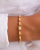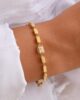 This elegant bracelet features a series of medium sized, rectangular 3D shapes intricately linked together, creating a fluid and modern chain. At its center, a chunky baguette-cut zircon stone framed by a delicate 18k gold border is exquisitely set. The geometric elegance of the bracelet offers a sophisticated yet contemporary touch, making it a versatile piece perfect for both everyday wear and special occasions.