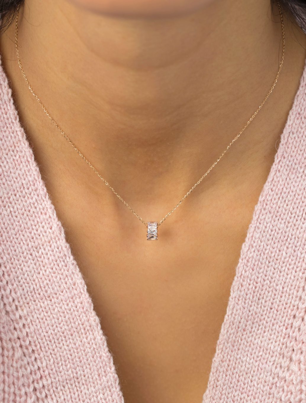 This cylinder shaped pendant, set with baguette cut cubic zirconia is the perfect addition to any outfit. Get it for yourself or as a special gift to a loved one!