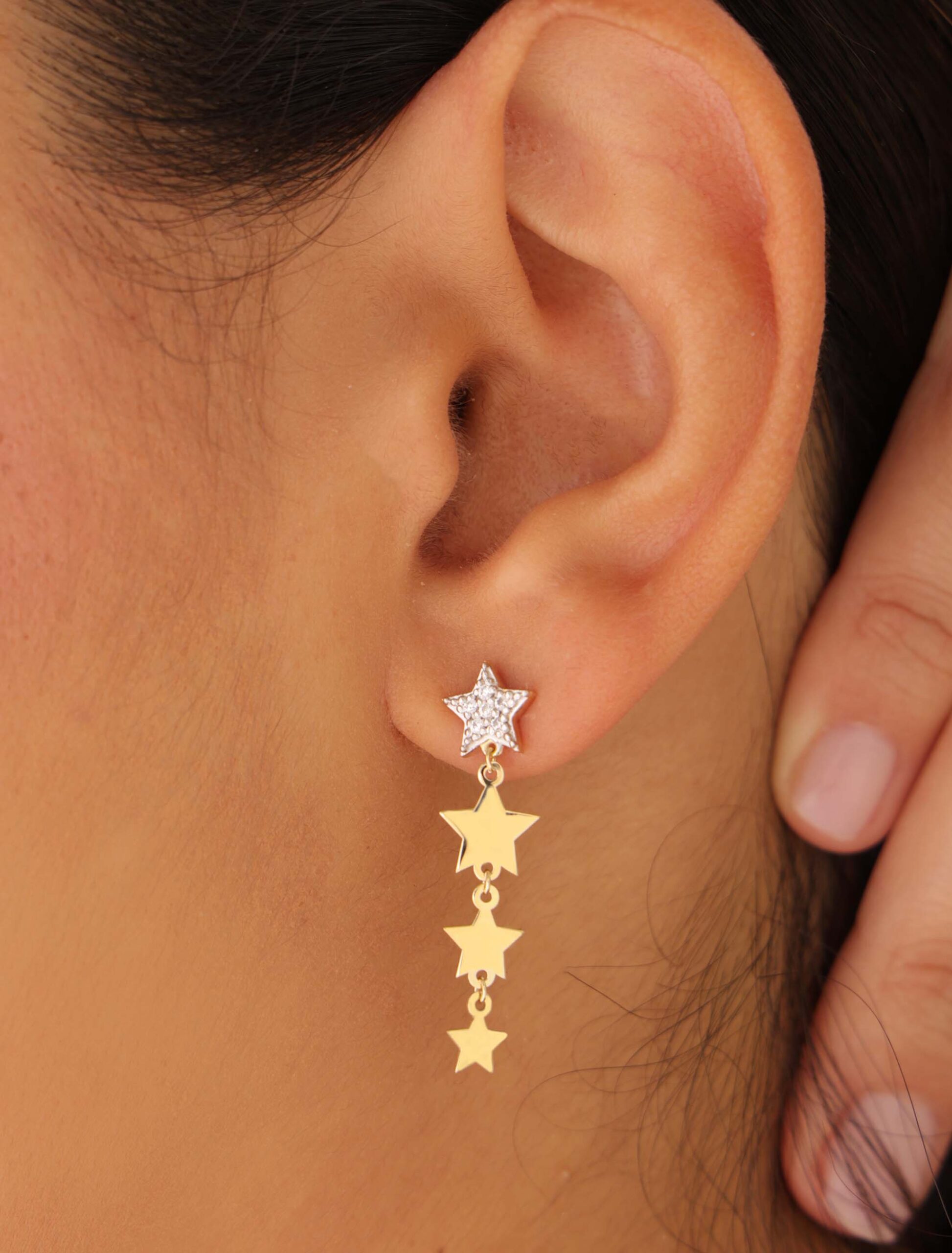 At the heart of each earring is a radiant star encrusted with shimmering zircon stones and adorned with white gold rhodium for extra shine, catching the light with every turn. Gracefully dangling below are smaller polished gold stars, creating a cascading effect that feels both whimsical and sophisticated.
