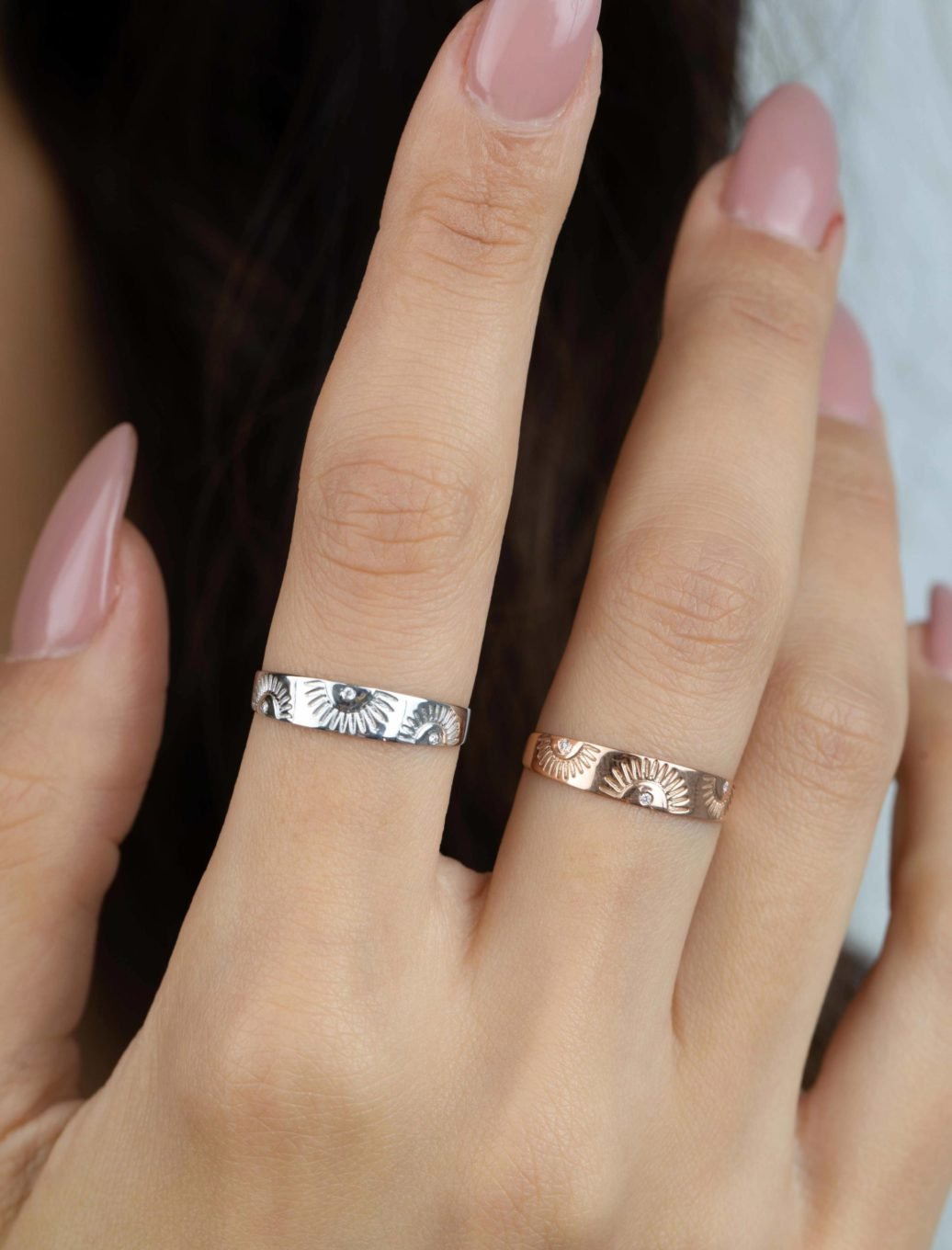The “Sun Goddess Ring” features upside down sun engravings with a diamond in each, evoking the glow of the sunlight and symbolizing light and the love of life. Showcase it on its own or mix and match with others from the range to create a unique, highly individual look!