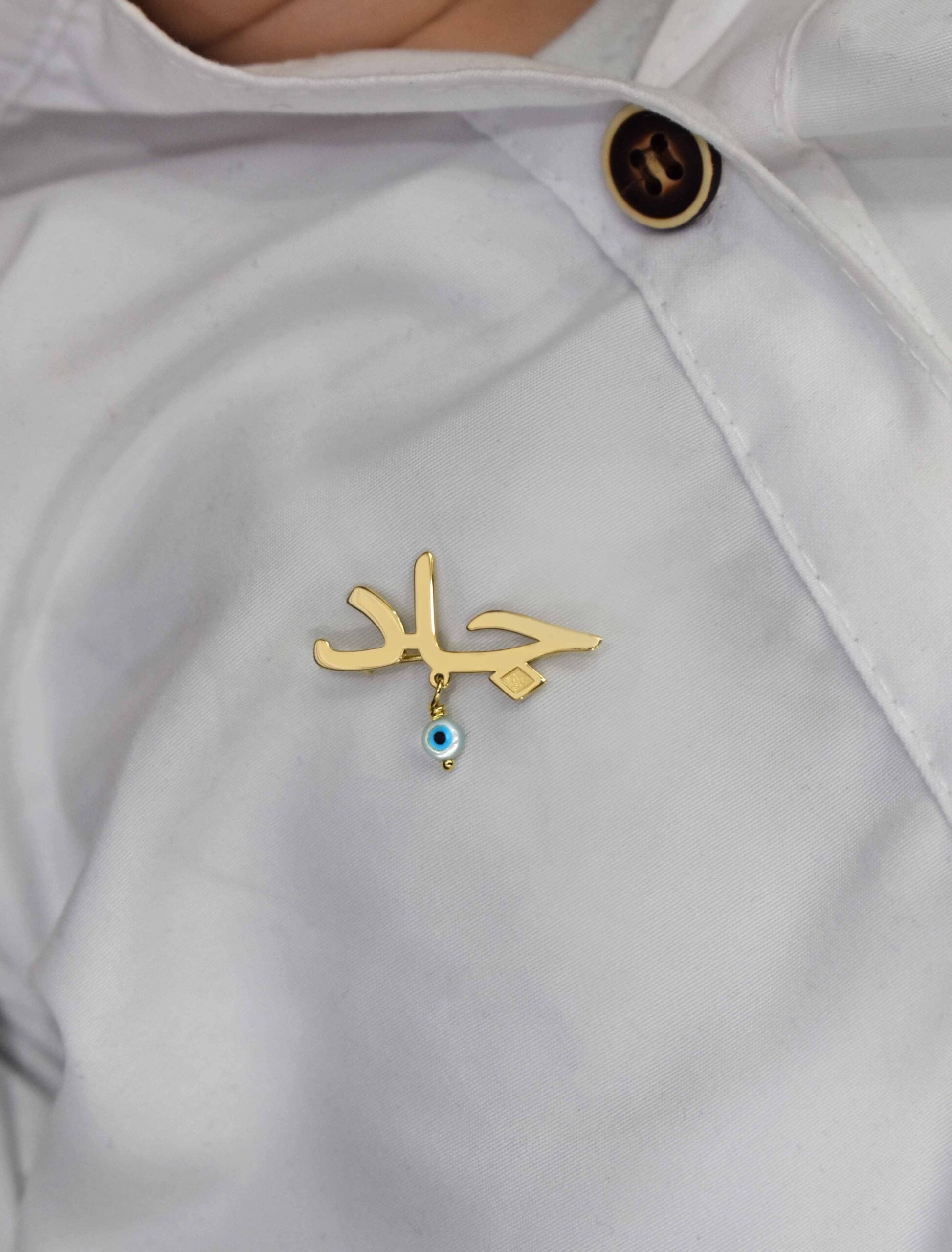 Thoughtfully designed for newborns, this 18K gold safety pin features a personalized name, complemented by a delicate evil eye charm for protection. A meaningful blend of tradition and elegance, it is a cherished keepsake to celebrate new beginnings.