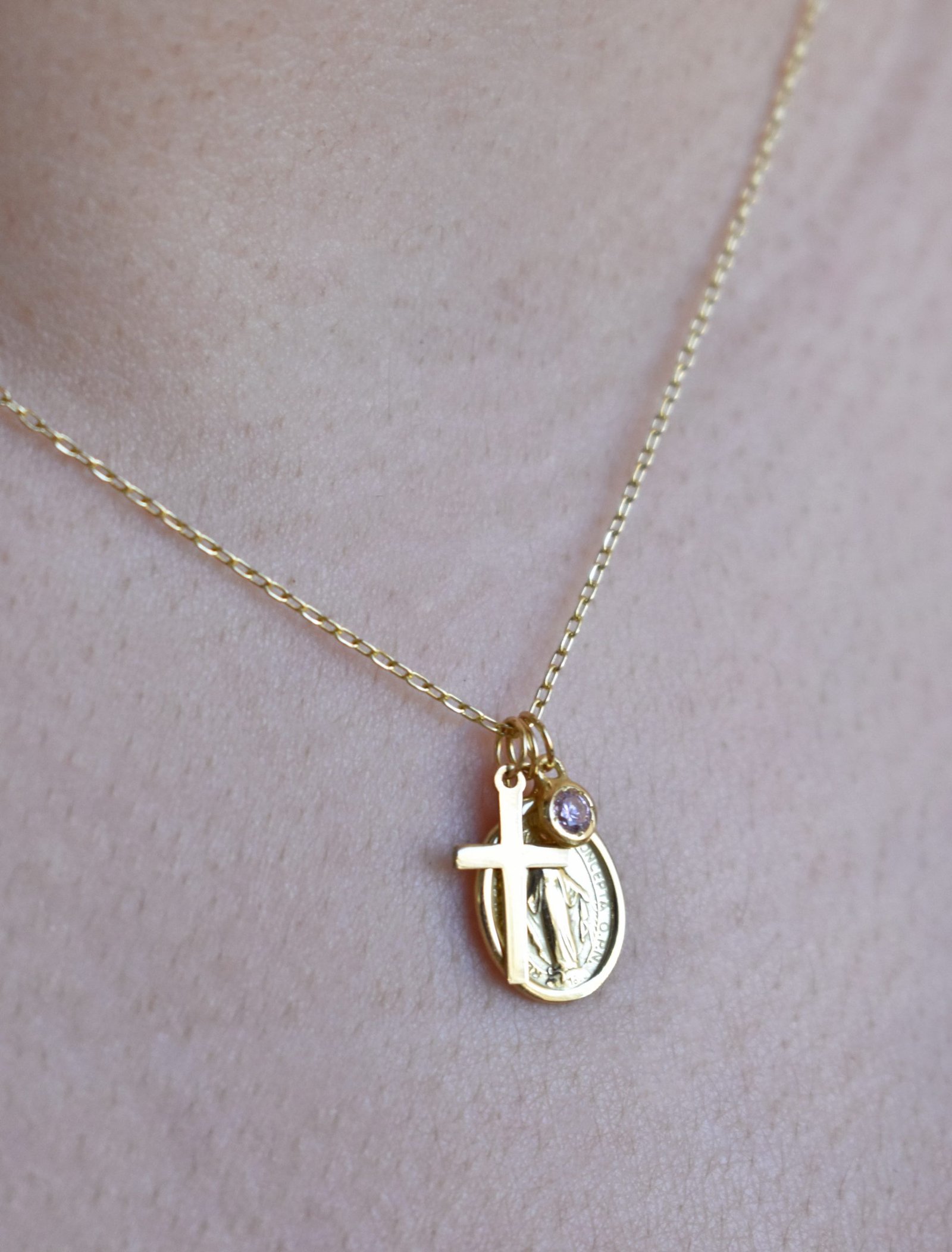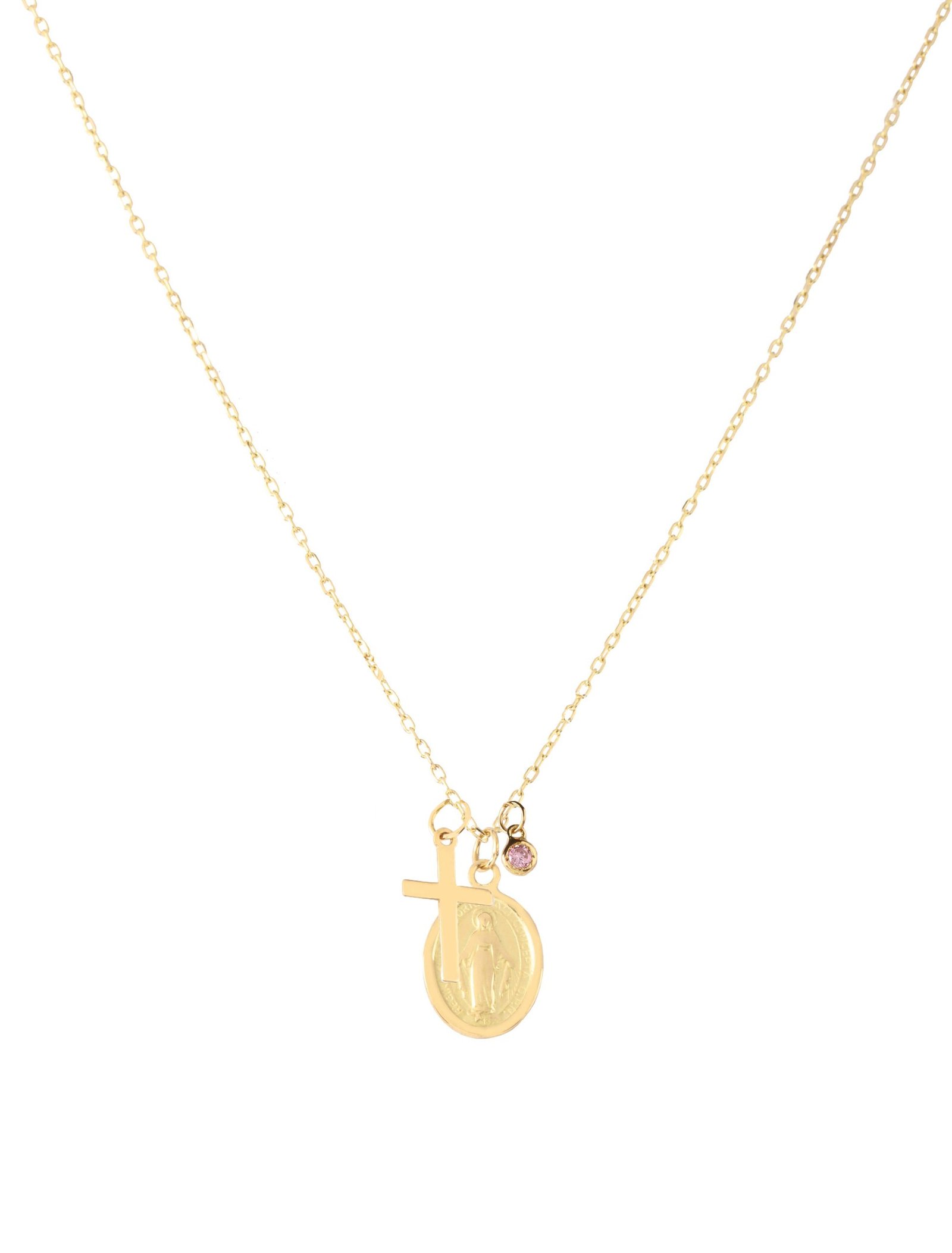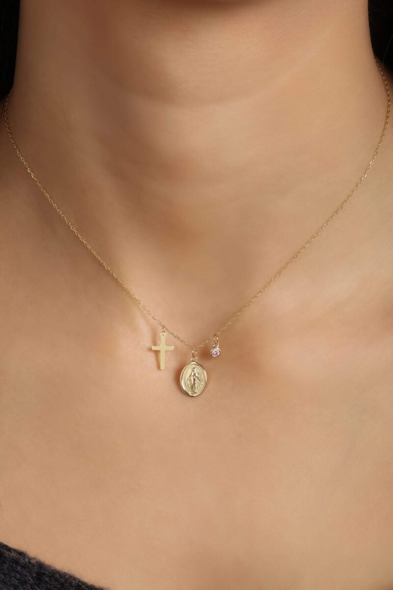 This 18k Gold Necklace beautifully combines the Virgin Mary icon, a personalized birthstone, and a delicate cross, creating a meaningful piece of jewelry. The Virgin Mary represents love and faith, while the birthstone adds a personal touch. The cross completes the design, making it a perfect expression of spirituality and devotion. A timeless and heartfelt keepsake, ideal for personal wear or as a meaningful gift.
