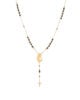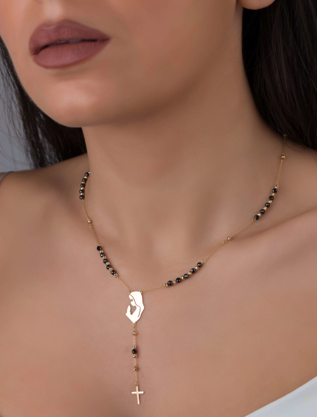 This gorgeous rosary features the Virgin Mary icon and a dangling cross and is embellished with 18k gold beads along with onyx black beads. Made to last you a lifetime, you will cherish it forever.