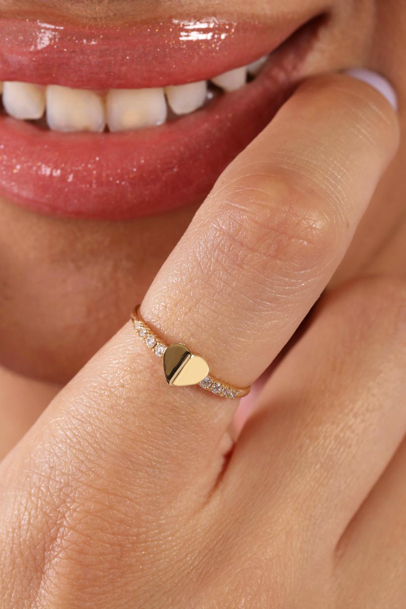 Radiating elegance and emotion, this 18k gold ring features a band delicately embellished with shimmering zircon gemstones for a continuous touch of sparkle. At the center sits a uniquely designed heart with a piled effect. A romantic piece that blends modern craftsmanship with timeless sentiment.
