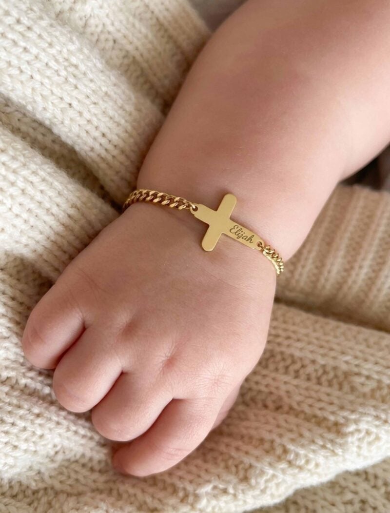 • 18K Gold Customized Horizontal Cross Newborn Bracelet With Cuban Link Chain